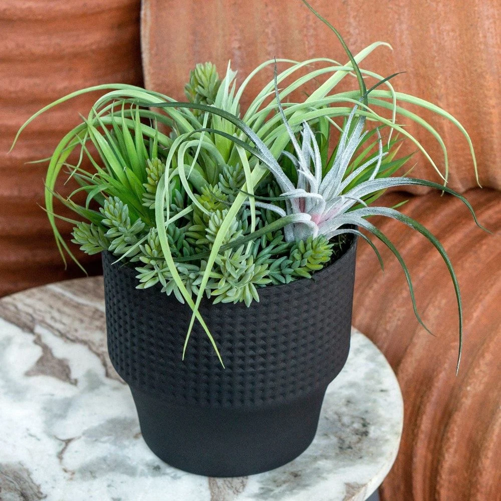 The new light and airy modern trend that’s filled with moody texture. Contact us for your custom quantity order. Aluminum planter is handcrafted with a textural black powder coat finish. Protect table surface. Indoor only.