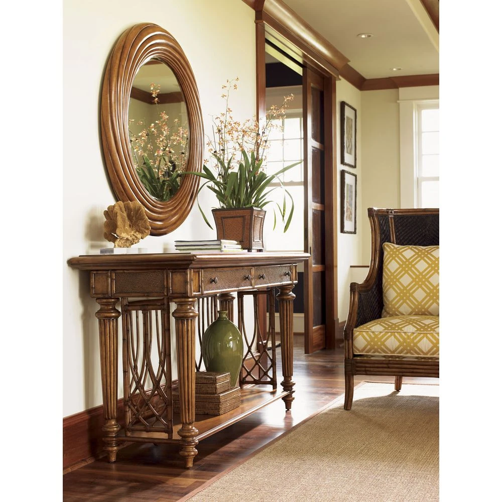 Marketing Copy: The refined Caribbean styling of Island Estate is infused with a rich blending of natural materials like woven Abaca and Lampakanai, Coco shell, Penn shell, leather-wrapped bamboo, and woven rattan. The rich Plantation finish blends effortlessly with the Noche Black, Cilantro Green, and Sangria Red accent finishes, while signature island fabrics draw the outdoors in. Capture the essence of sophisticated island living with Island Estate from Tommy Bahama Home – a relaxed approach to the finer things in life.