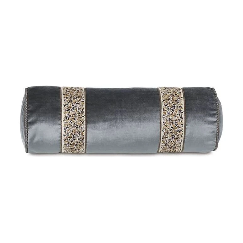 - Bolster in solid velvet fabric with embroidered border trim applique