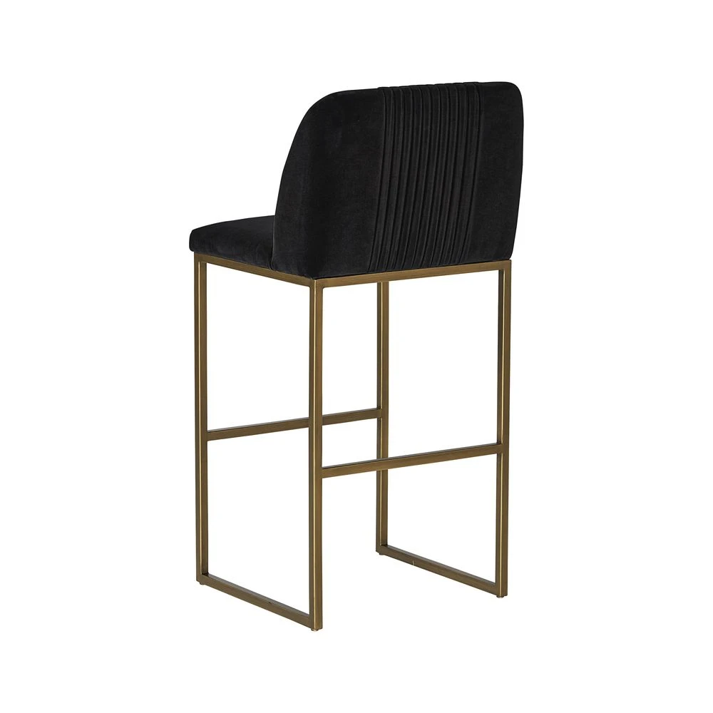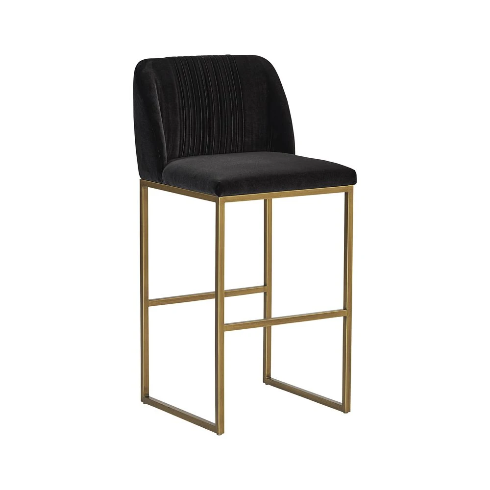 Description: A modern barstool from that offers style and comfort. Features delicate ruching on the rounded seatback and exposed antique brass legs. Stocked in shadow grey fabric. Suitable for various dining, kitchen and bar spaces of all sizes.