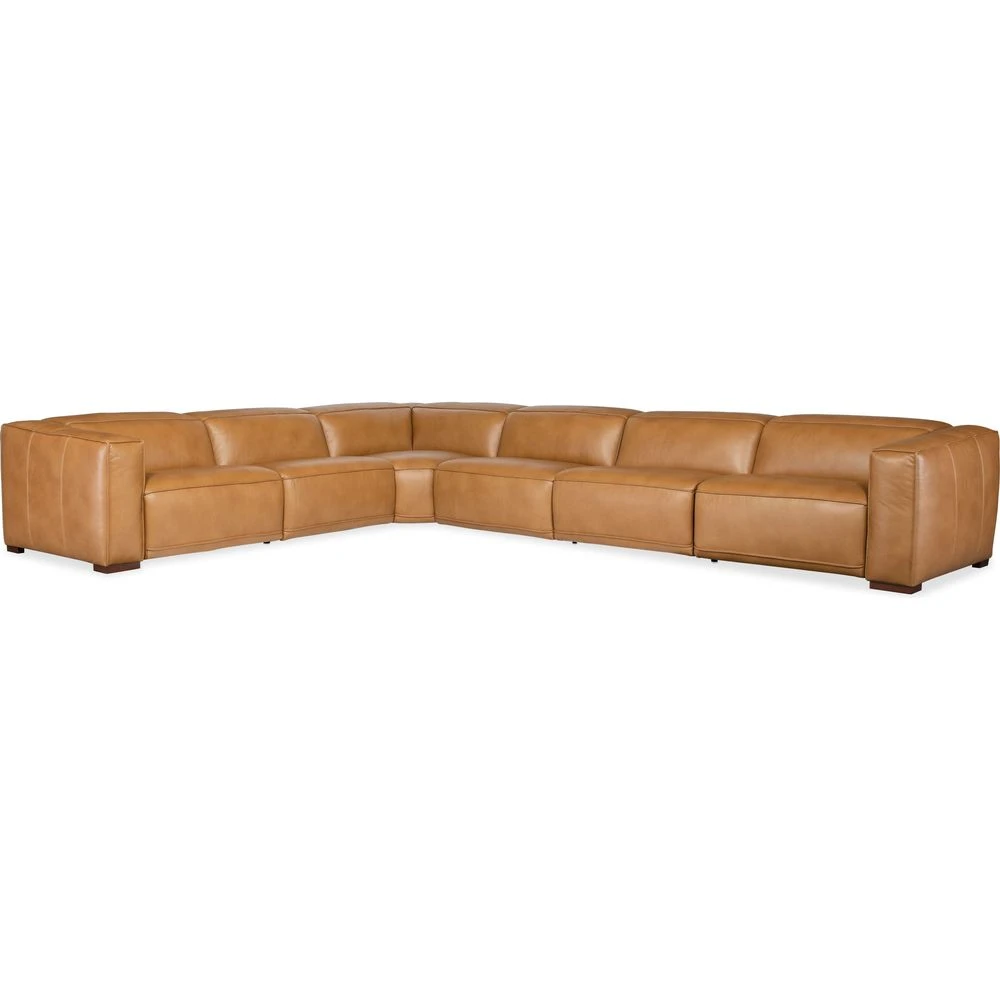Description: A sleek, low-profile silhouette with wide track arms and wood block feet is married to a warm and inviting caramel-colored luxurious semi-aniline leather cover in the Nimbus 6-Seat Sectional. Featuring power recline and power headrest, the pieces include two armless chairs, an armless power recliner, corner wedge and left and right sofa ends.