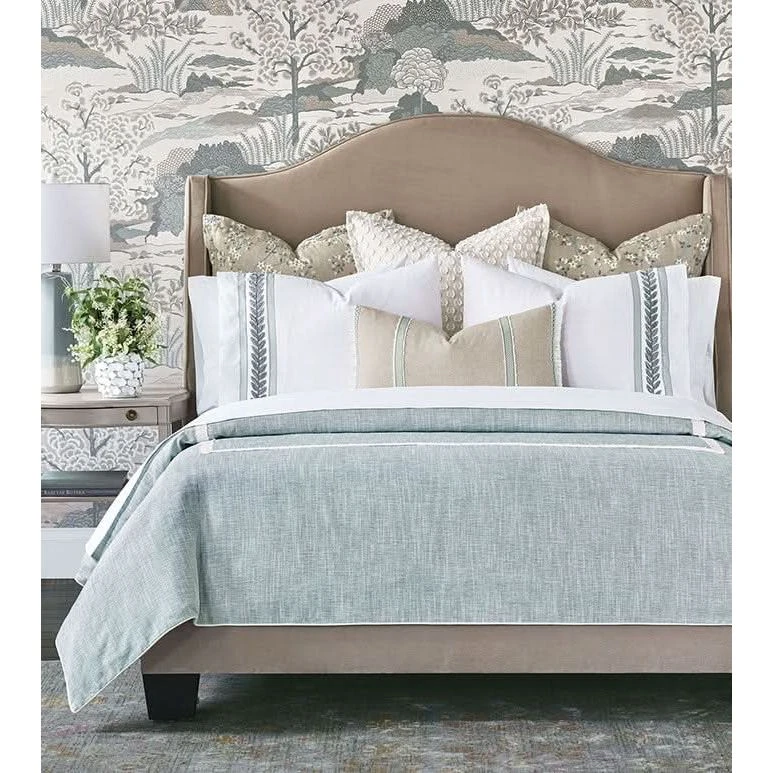Step into the soft-toned, ethereal world of Oasis. Its neutral linen and cornflower blue textiles create the perfect backdrop for delicate botanical embroidery and picot ribbon detailing. Complete the look with Amberlynn’s crisp white shams featuring custom velvet decorative borders for an effortlessly fresh, romantic finish.