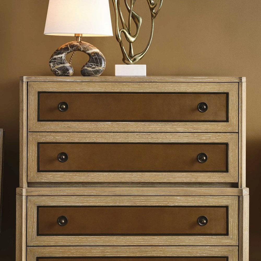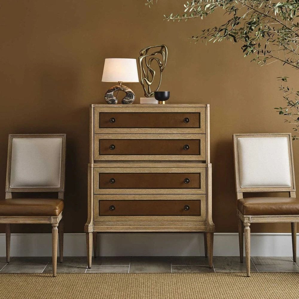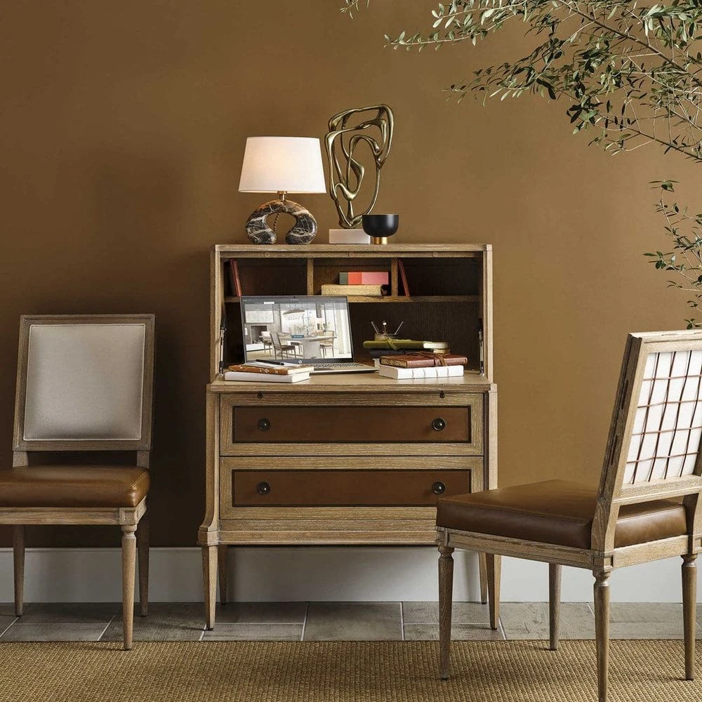 A modern design inspired by elegant Regency style, this oak cabinet features two generously sized storage drawers on bottom and one cleverly-concealed pull-down door on top, that when open, converts into a functioning desktop and reveals additional storage space, three cubbies, and an LED touch-summary dimmer switch with adjustable lighting. Additional details include custom solid brass pulls in a bronzed finish, center panels of contrasting leather set within bronze-finished metal frames, and tapered legs. A light stain finish with white cerusing highlights the oak’s natural grain.