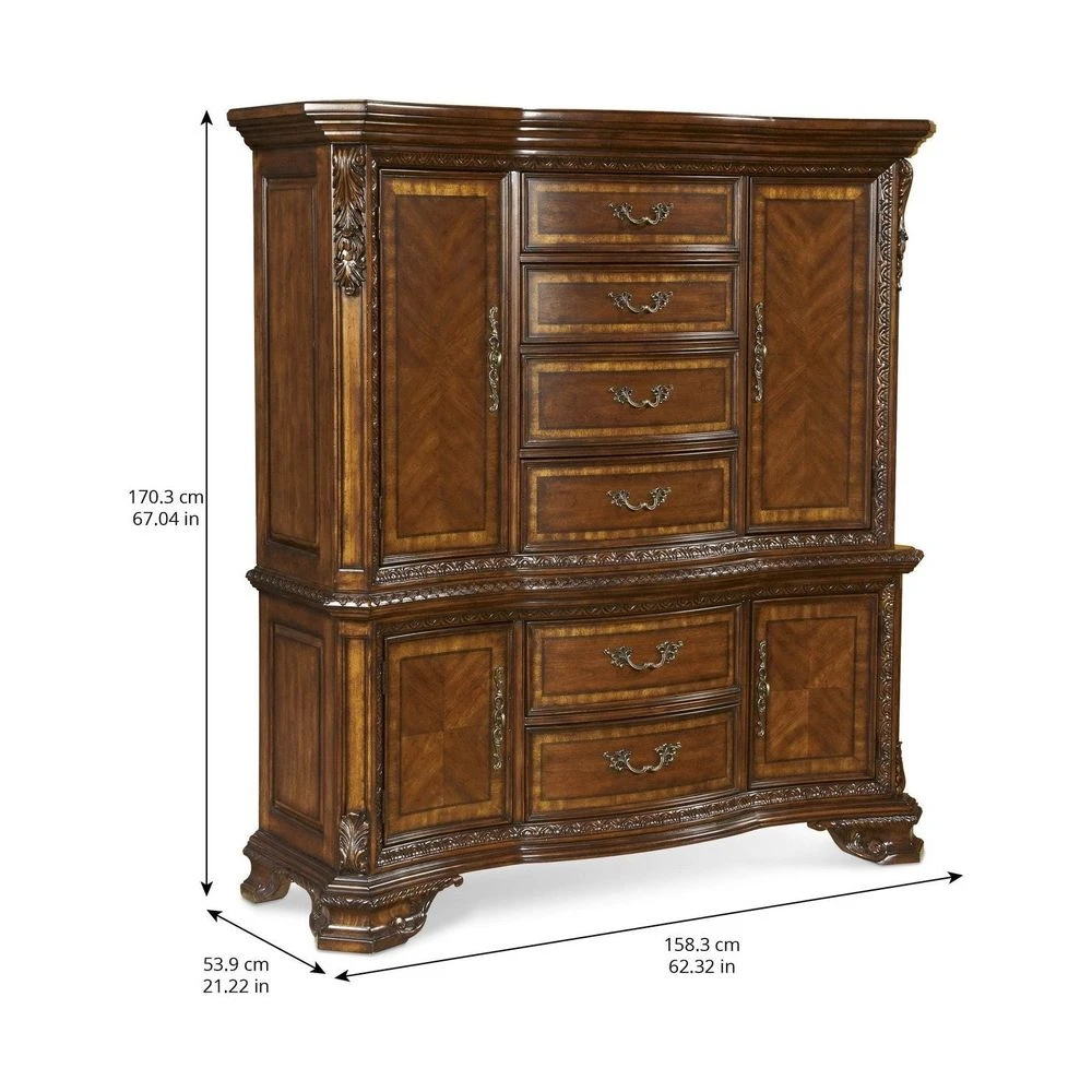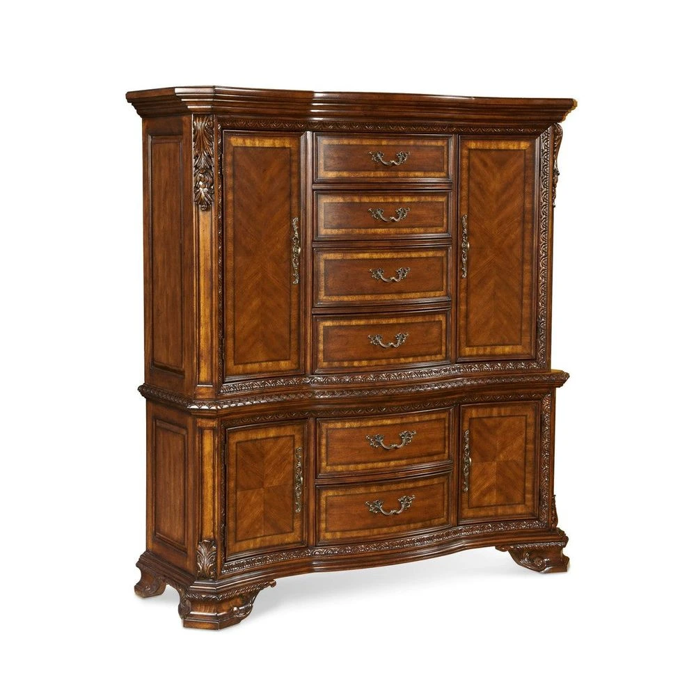 Description: The multi-functional Old World Master Chest provides versatile storage in the bedroom. The chest is actually two separate pieces: the bottom section, with two drawers and two cabinets, has a finished top of plain cherry veneer so that it can be used as a stand-alone piece, and the top four-drawer section has two adjustable shelves behind each door. The upper piece also includes a hidden valet behind the touch latch end panel with a ring roll, four hooks and nine lined tray niches. The left upper cabinet is mounted with a mirror on the inside of the door. Both sections have the elegant traditional detailing that is the signature of the Old World Collection: acanthus leaf carving, a gracefully shaped silhouette, sunburst veneers, and a hand rubbed and burnished pomegranate finish.
