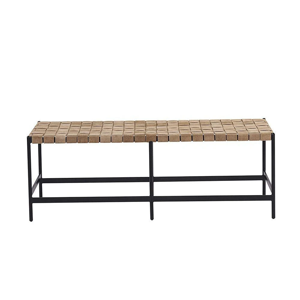 This elevated bench offers ample seating and unique style. Features a weaved seat in light tan leather with a suede-like texture and finished with a black iron base.