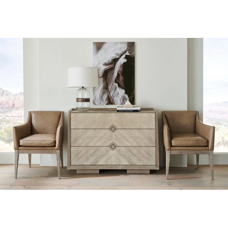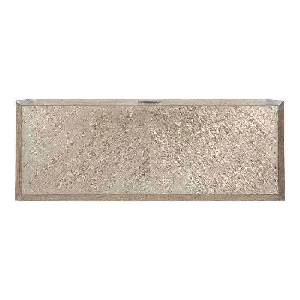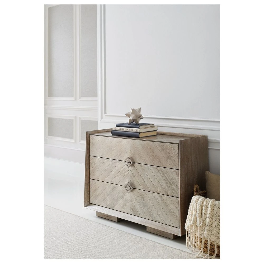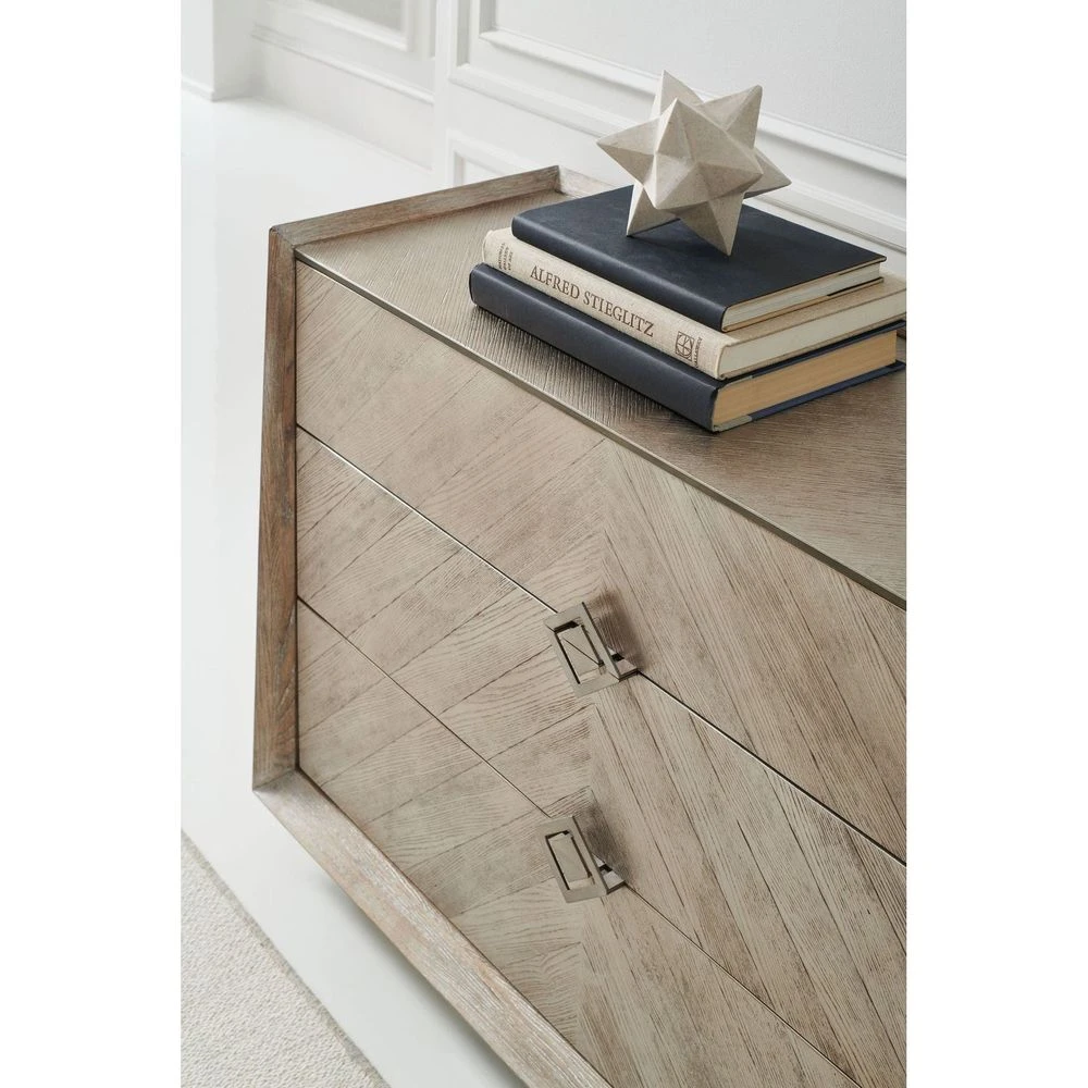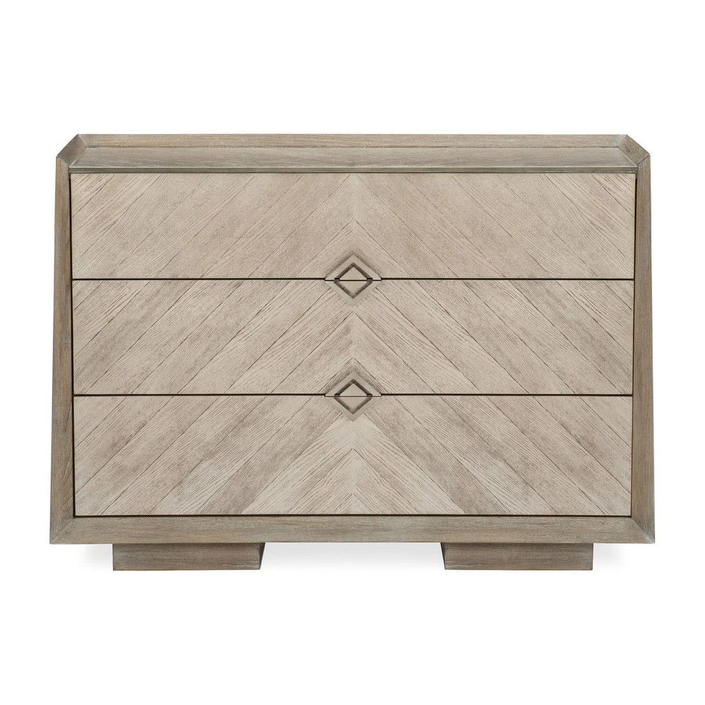Reflecting the modern organic beauty found only in nature, this remarkable chest lends authentic character to a space. Its simple silhouette is accentuated by perfectly matched directional wood grain veneers that create a one-of-a-kind chevron pattern. An easygoing shade of Ash Driftwood highlights the stunning wood grains featured along its exterior while a Silver Driftwood finish brings out the beauty of the woodgrain pattern on top. A metal bead in Sundance Gold outlines the top and adds another touch of reflectivity while geometric drawer pulls and block feet give it substantial presence.