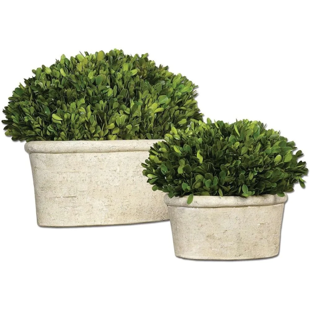 Preserved While Freshly Picked, Natural Evergreen Foliage Looks And Feels Like Living Boxwood Potted In Mossy, Stone Finished Terracotta Planters. Sizes: Sm- 10x8x6, Lg-14x12x8