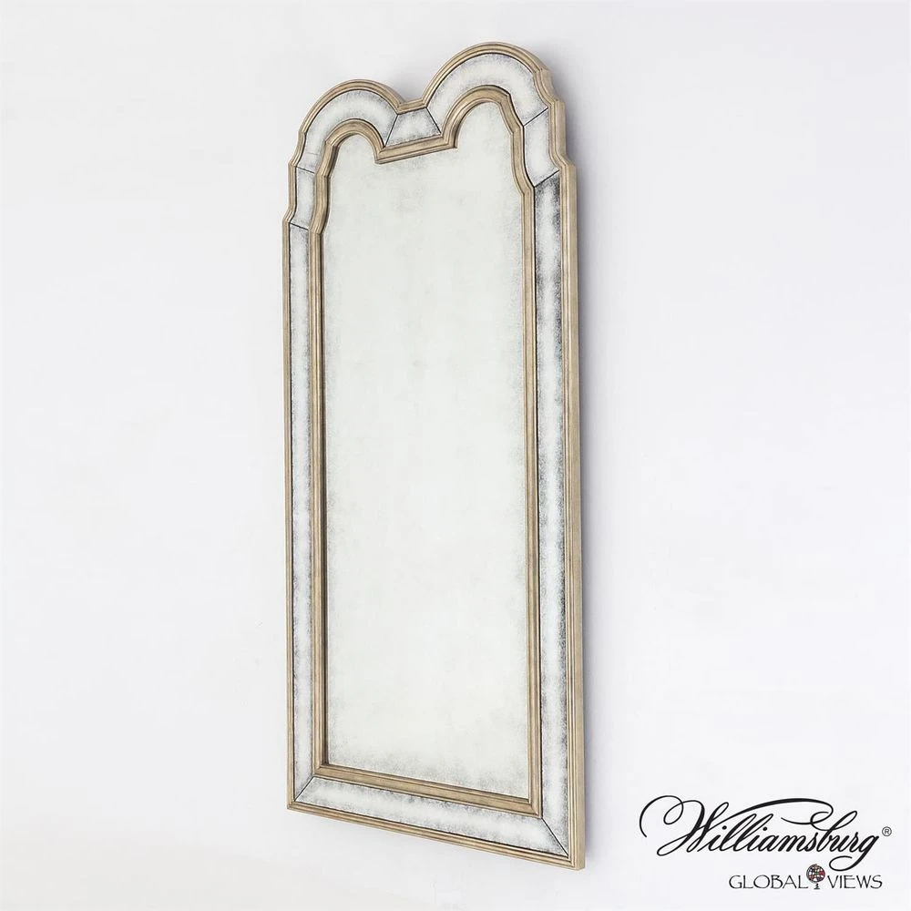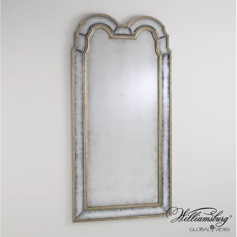 Inspired by a handsome pair of large gilded looking glasses in the central passage in the Governor’s Palace in Williamsburg, Virginia, the impressive silvered Palace Passage Mirror brings panache and polish to today’s interiors. The original mirrors, dating to about 1740, flank the doorway to the dining room, reflecting light from windows on the landing of the adjacent stairway. Glass and mirrors were extremely costly to produce in the early 18th century-think of the impact of Louis XIV’s Hall of Mirrors-so a full-length mirror was a status symbol.