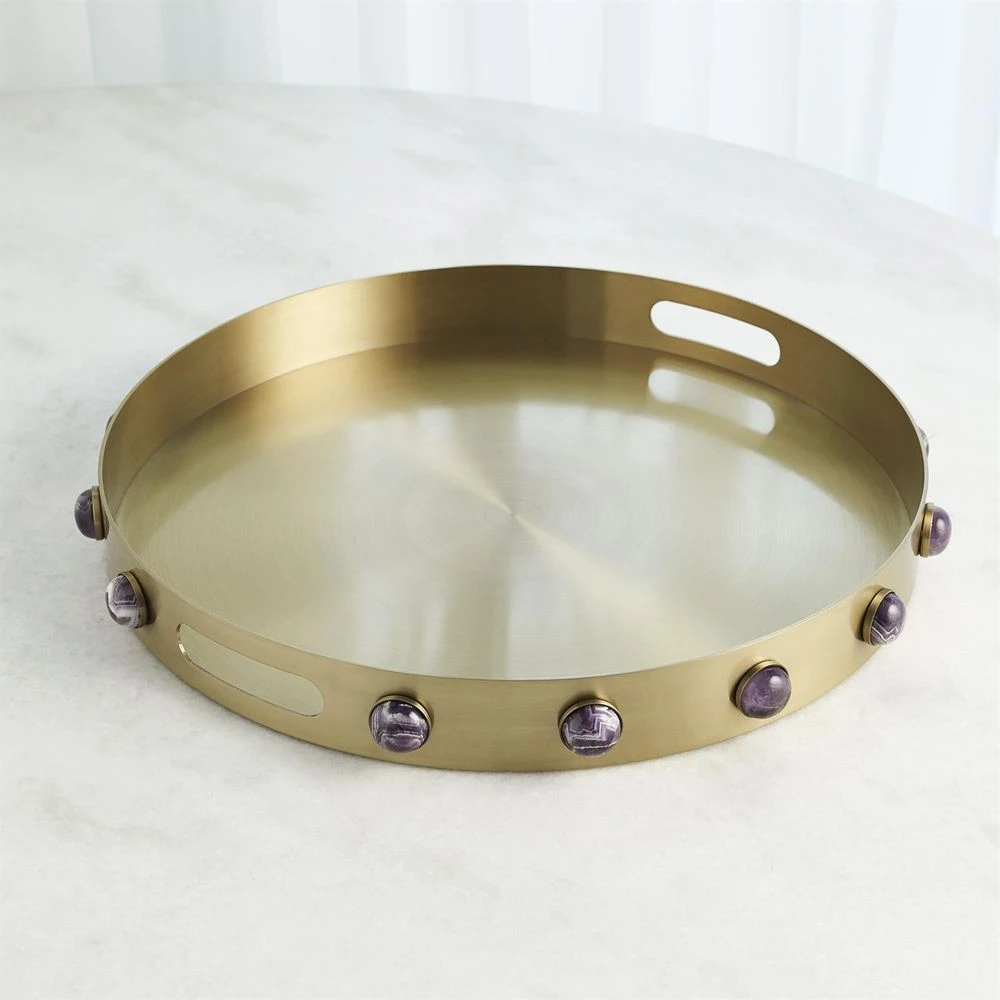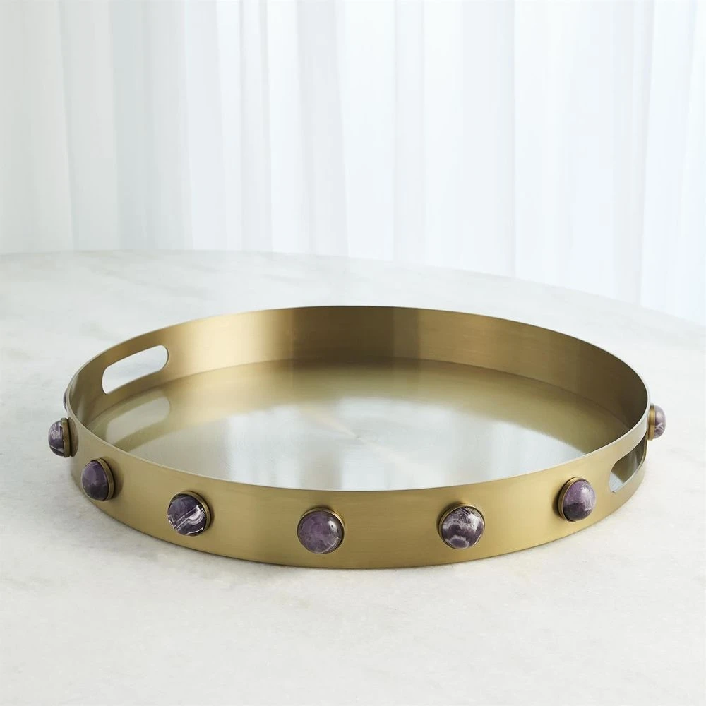 Description: Our Pandora Tray mixes the artistry of fine lapidary work with the practicality of stylish living. Handset amethyst stones adorn a gleaming satin tray, bringing artful sophistication to any space.