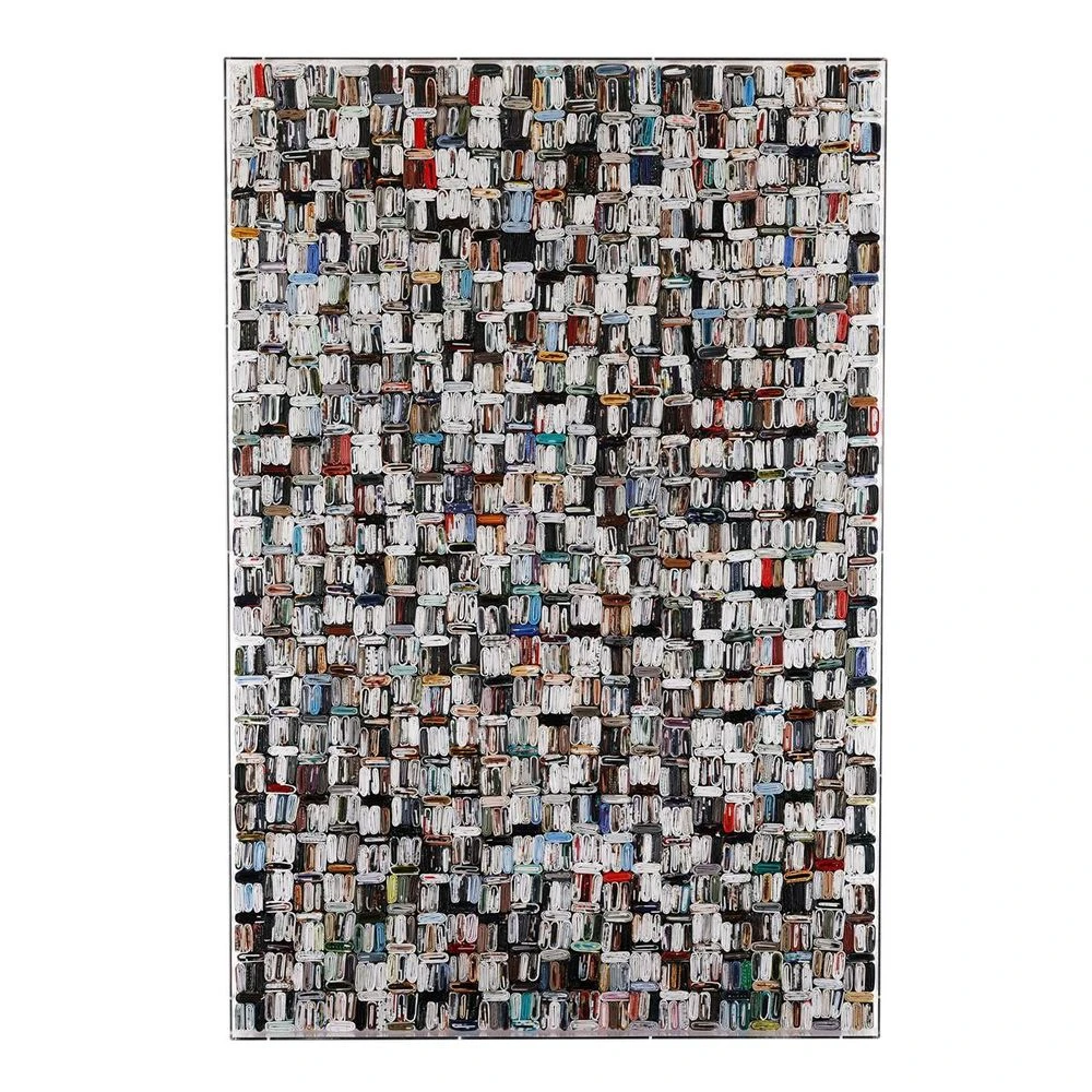 Paper Pixels produces a gorgeous, textural mosaic of paper on canvas. Black and white tones are punctuated by subtle splashes of color. This piece is displayed in a vertical orientation from a clear acrylic box.