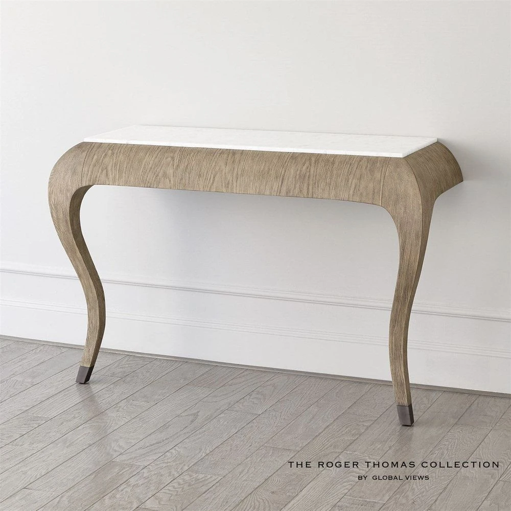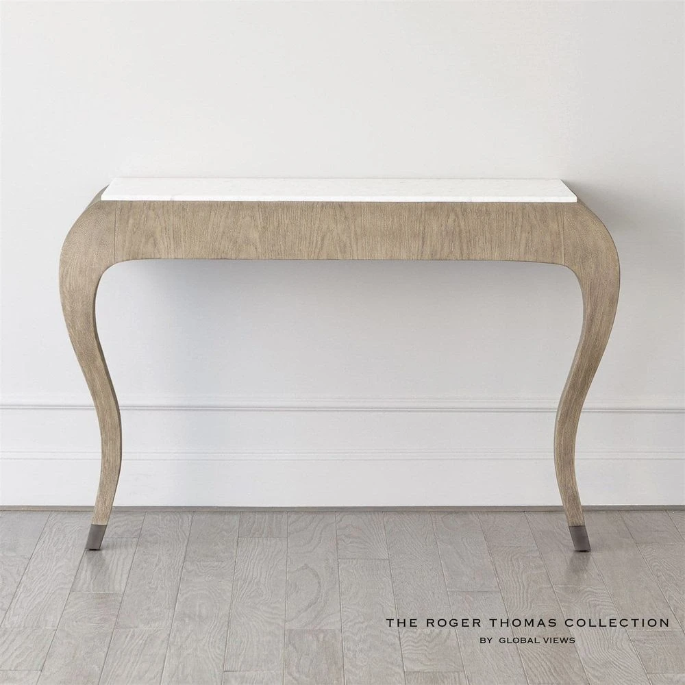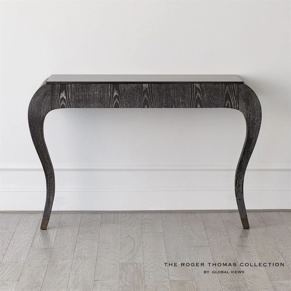Inspired by the silhouettes of 1930’s French cabinetmakers, The Paris Wall Console is made of grey sandblasted oak and has elegantly curved legs with protective cast aluminum feet.
