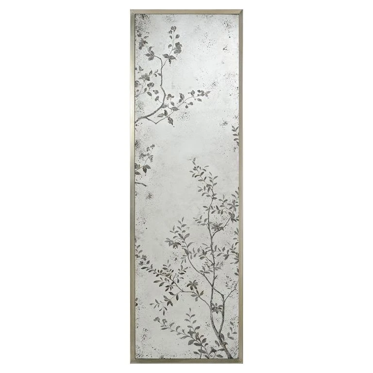 The Set of 3 Pastoral Mirror Panels depict a gorgeous scene with detailed flora displayed across reverse hand-painted mirrors. A stylish, chamfered frame in Pewter Silver provides beautifully complements to the artwork’s neutral tones. The panels come equipped with French cleats and are meant to be displayed from a vertical orientation.