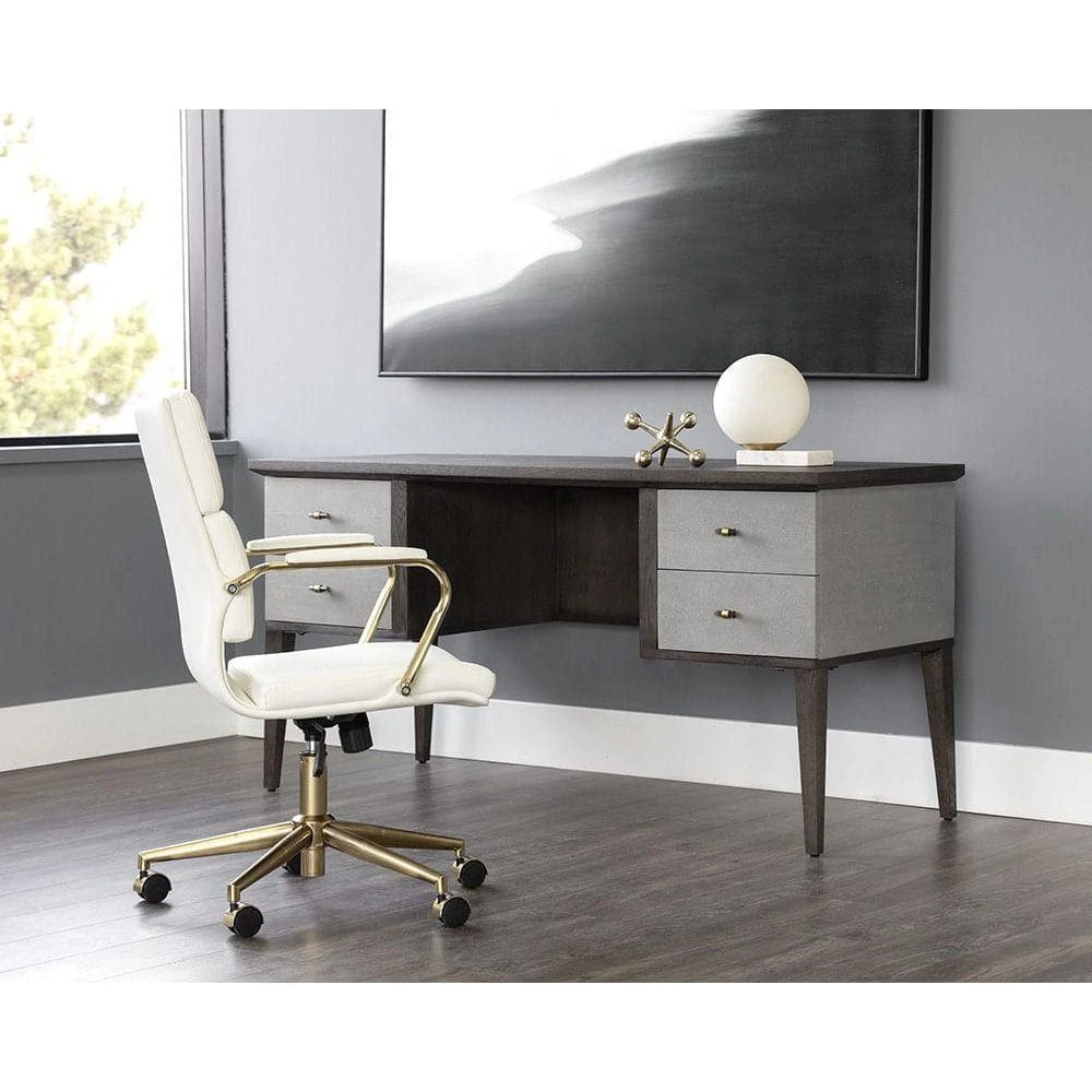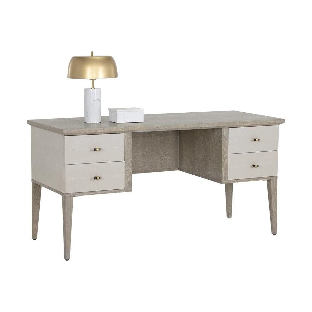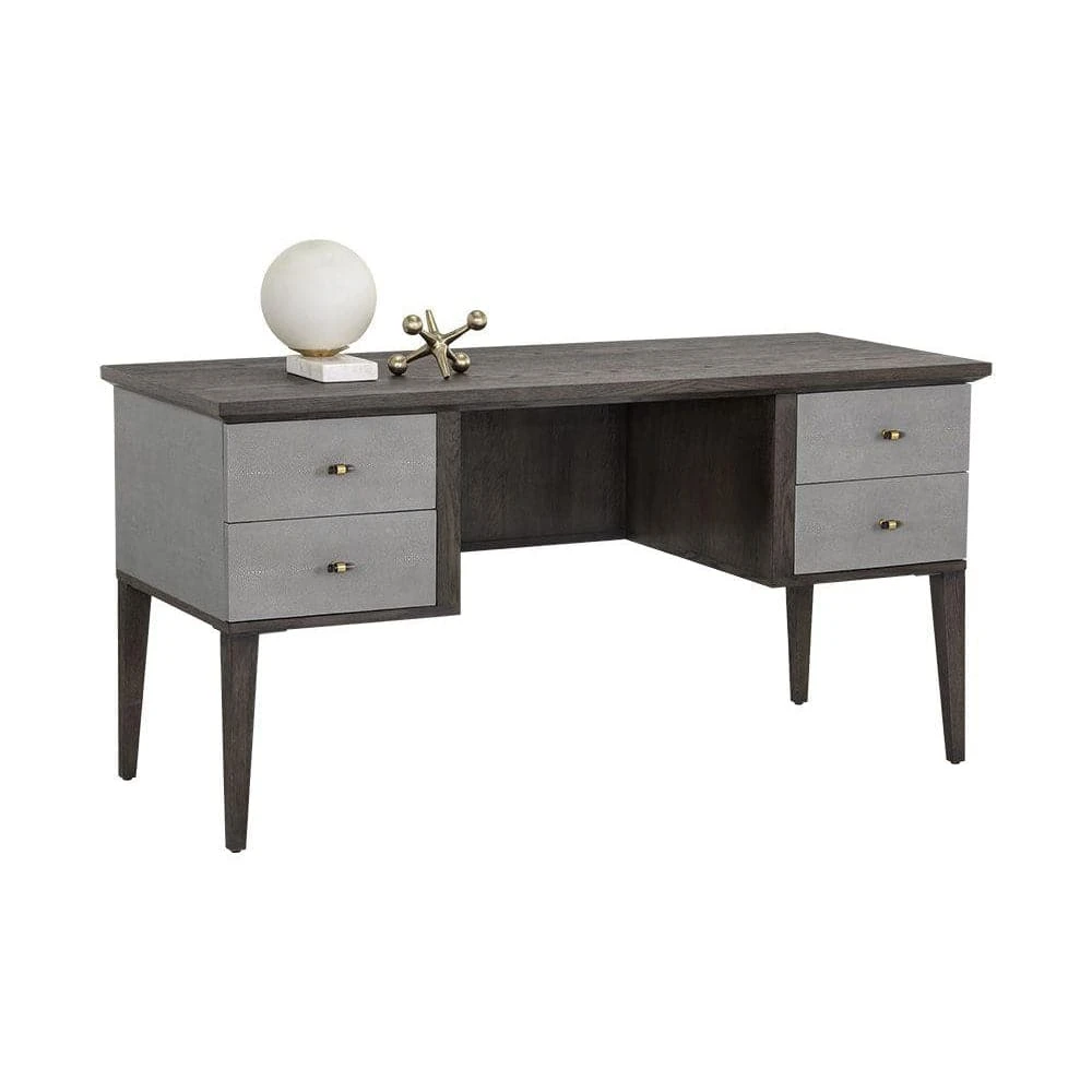 - ADDITIONAL FEATURES:Solid Oak Legs & Oak Veneer Top / Grey, Cream Shagreen Drawer Front / Soft Closing Drawers / Finished Back / Antique Brass Iron Handles