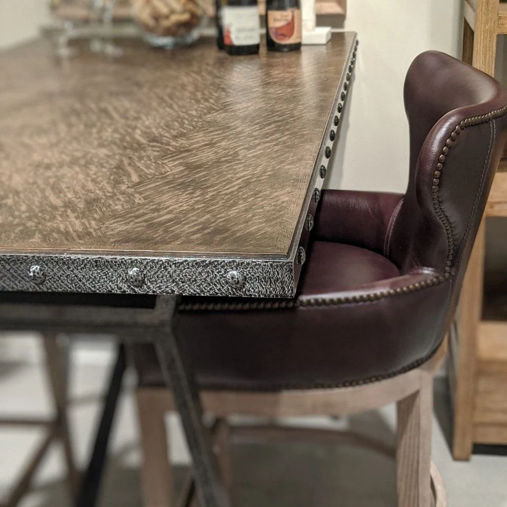 An adjustable gathering table with a herringbone flaky oak veneered top and banded in handsome hammered metal strips with an industrial nailhead element. Adjustable at 36.5″ H or 42.5″ H with removable extensions.
