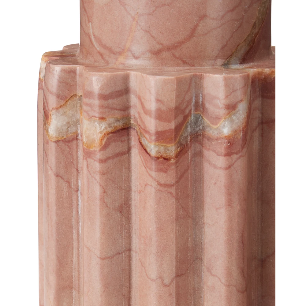 Description: The Penrose Pink Candle Holder Set includes two candle holders made of a Rosa Cappuccino marble. The geometric shapes that comprise its profile are enlivened by the natural veining of the stone, making each one unique. The characteristics of this stone bring a warm pink and deeper rose interplay to their surfaces.