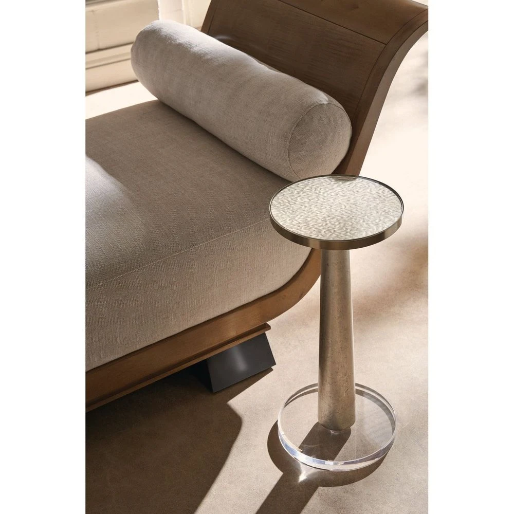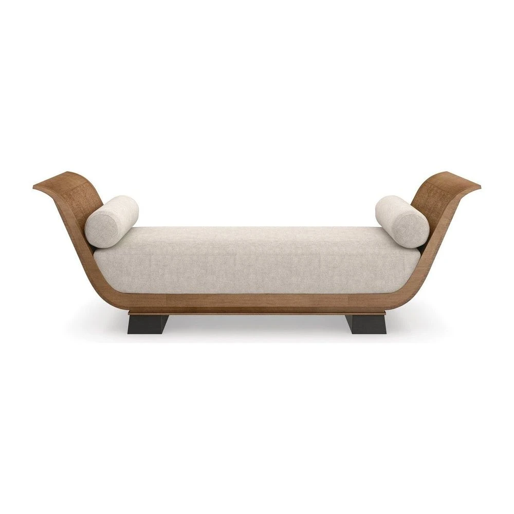 With a nod to Greek and Roman antiquity, this chaise introduces lounge-like comfort and a classic undertone. Its daybed form recalls pieces used throughout history to lounge comfortably yet respectably in the presence of guests. Dressed in a light-toned linen with matching bolster pillows, warmly contrasted by an arcing frame in Toasted Sycamore and plinth legs in a rich Charred Bark finish. Style in a seating area designed for conversations or use it to separate two designated spaces in a room.