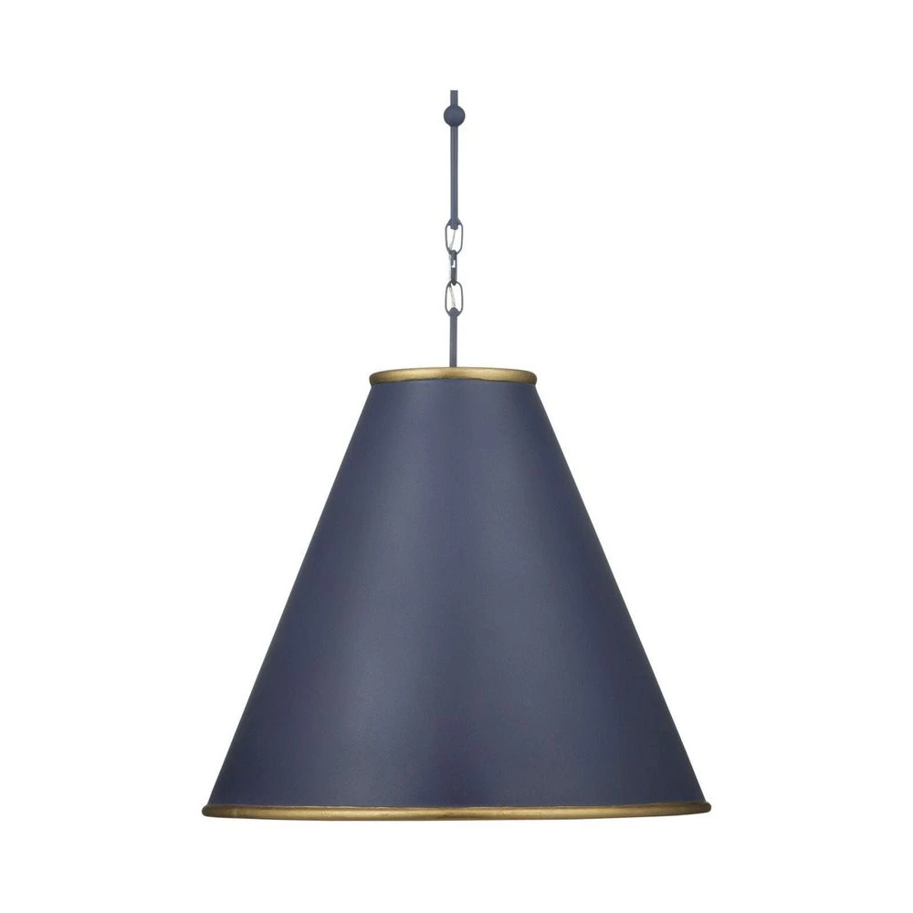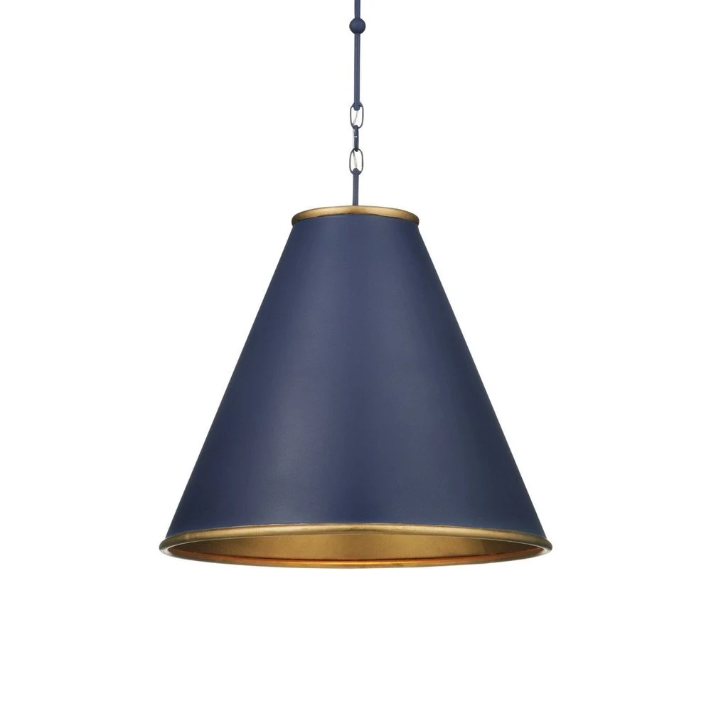 Description: The Pierrepont Large Blue Pendant is made of wrought iron with a Hiroshi Dark Blue finish on its exterior and a contemporary gold leaf finish on the interior of its shade. The rolled edges of the rings connecting them, at the top and bottom of the pendant, gleam in a gold finish and are sophisticated details that bring an uptick in style to this handsome fixture. When simplicity is the aim, the Pierrepont will fit right in given the clean lines of the fixture’s profile and its hanging hardware. Adjustable from 26.75″ to 104″ with use of included chain/rod kit/cable. If your space calls for a longer drop, additional chain/rods/cable is available for purchase.