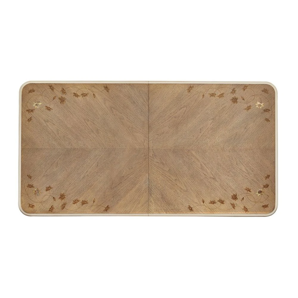 If you’re looking to take your dining room to new heights, look no further. Designed to impress, this spectacular rectangular dining table commands attention and conveys luxury in every detail. You may never use a tablecloth again once you see this one-of-a-kind table’s silkscreened top inspired by antique marquetry and accented with Mother of Pearl inlay. Three stunning signature finishes of Cendre, Champagne Mist, and Aglow combine to create a rich mix of metallics that reflect light and cast a warm glow. Shapely cabriole legs featuring period carvings support this table’s grand top and flow smoothly into the apron. Perfectly sized at 84 inches, the dining surface can be expanded to 120 inches with the addition of two 18-inch leavesÄîtransforming easily from family dinners to entertaining.