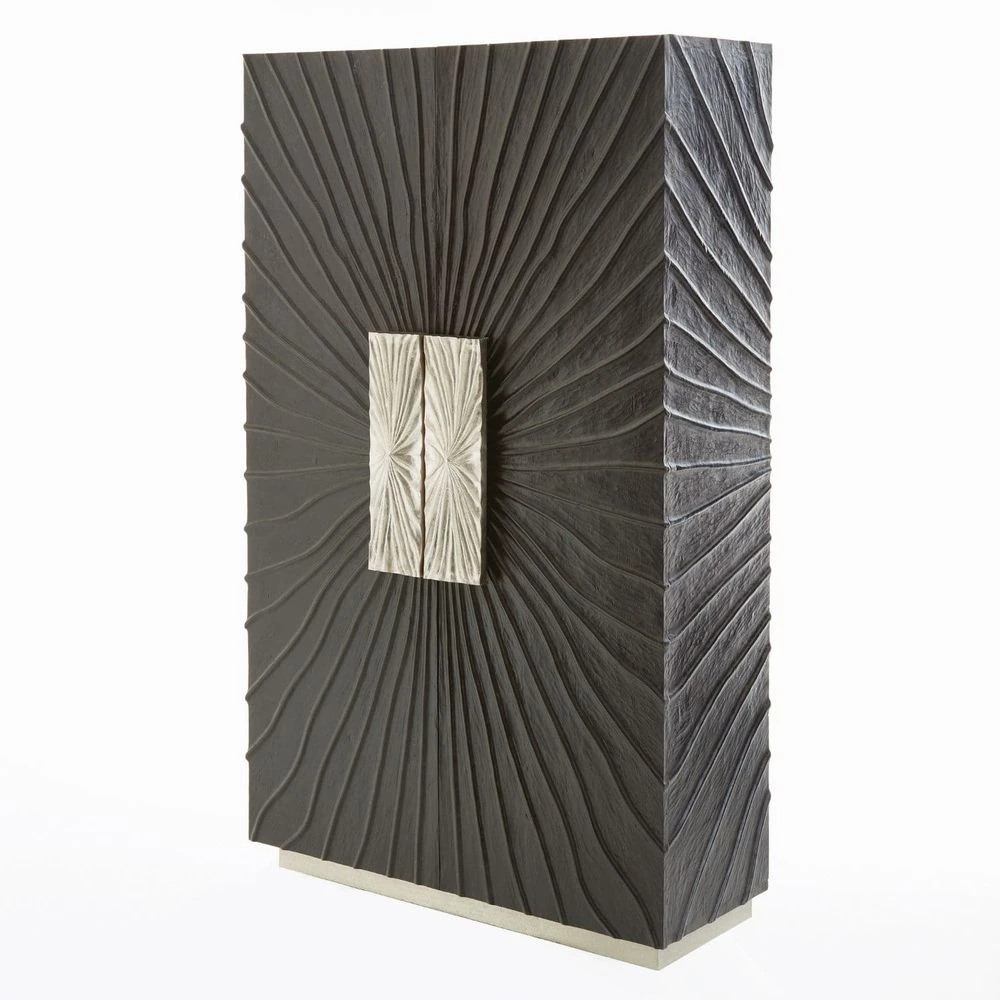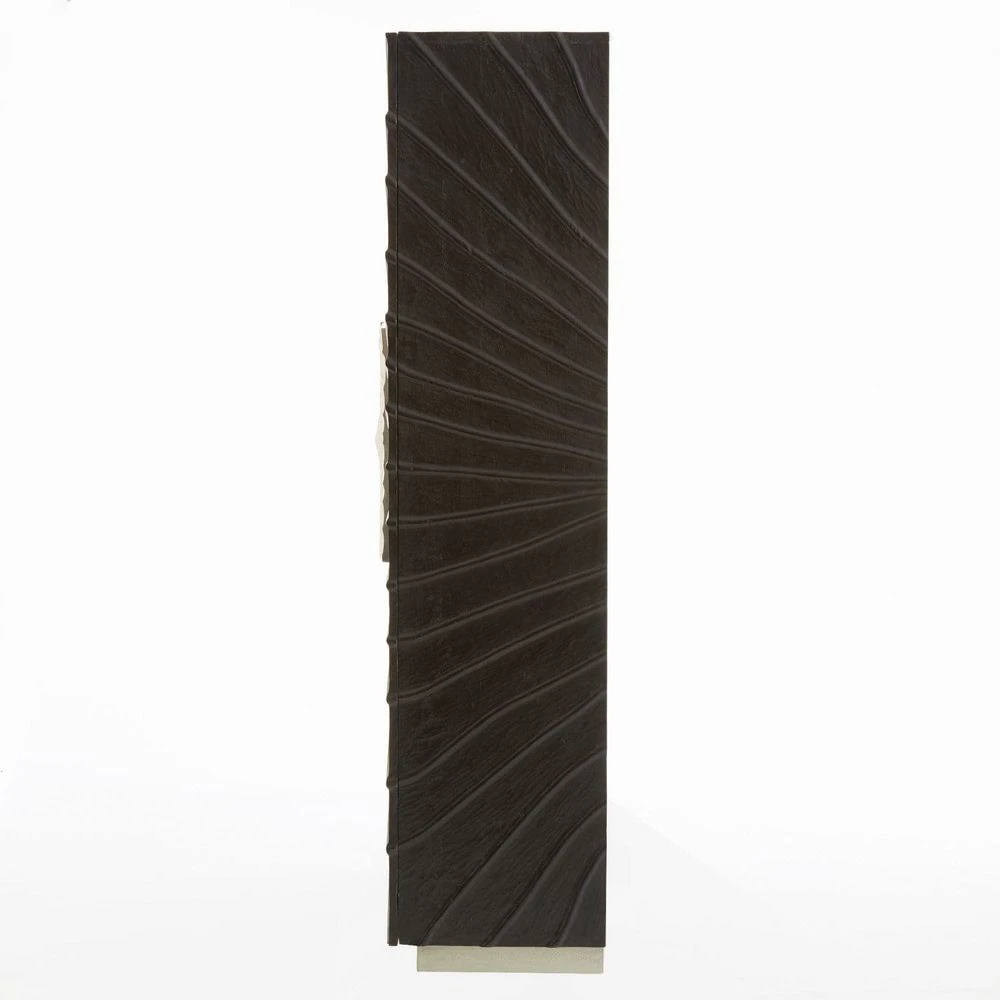Pleated cabinet is vintage inspired. Textured pine wood in a black onyx finish with cast aluminum, door pulls, mirrored back, one fixed shelf, two adjustable glass shelves, and three push latch drawers with a metal clad base.
