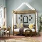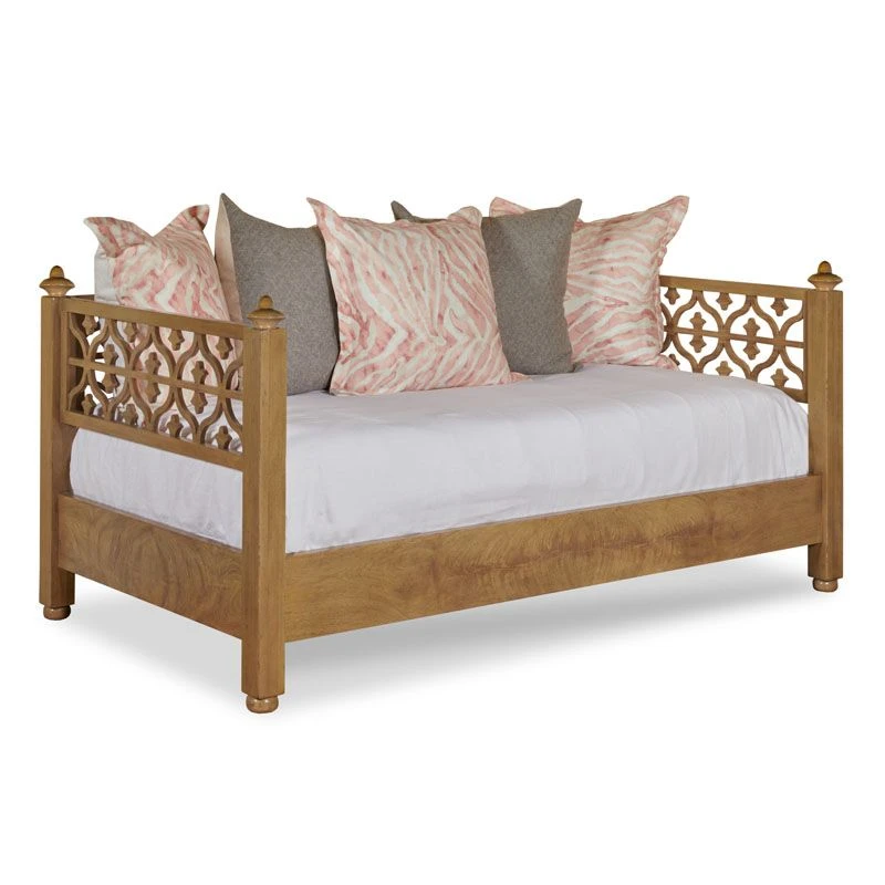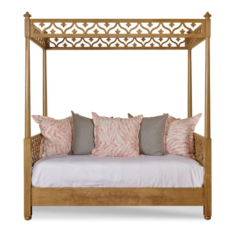 Description: A terrific day bed that is a blend of French and Asian styles from the 18th Century. Four pierced fretwork tester rails top four rounded tapering corner posts over pierced fretwork side and back panels elevated on stylized bun feet.