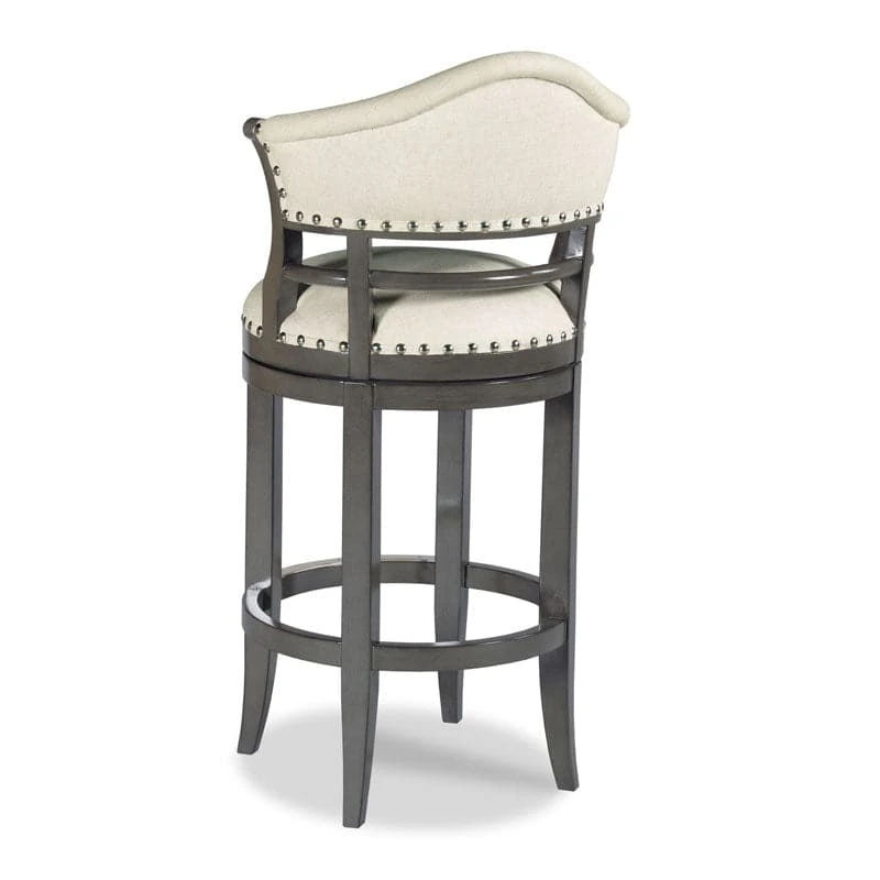 An exquisite swivel stool with an upholstered camel back flanked by flared volute arms over a cushioned seat elevated on squared flared legs.