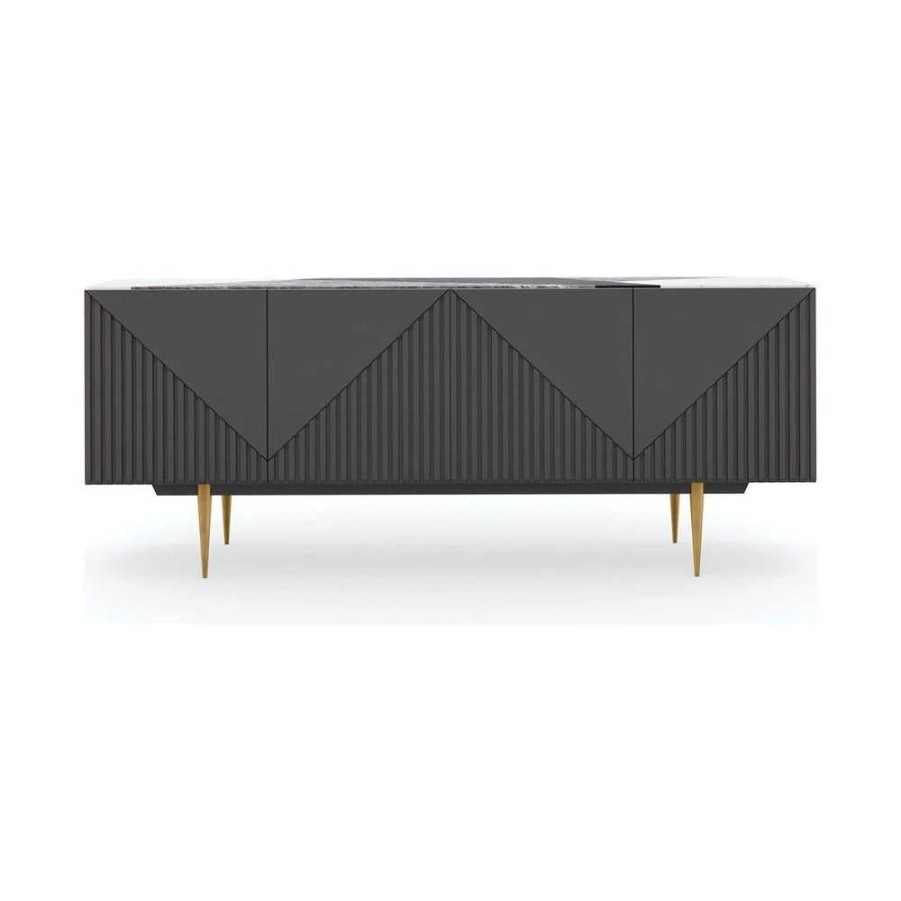 Bring a modern form to traditional dining with our Over the Edge buffet, finished in Warm Slate and a mix of polished marble and stone. Graphic slat details add dimension to this contemporary design, balanced on tapered metal legs in Champagne Gold. Perfect for happy hours and hosting, it offers generous storage with two drawers, adjustable shelves and open space, neatly concealed by touch-latch doors. Or, style as a statement-making console in living rooms, halls, and entryways.