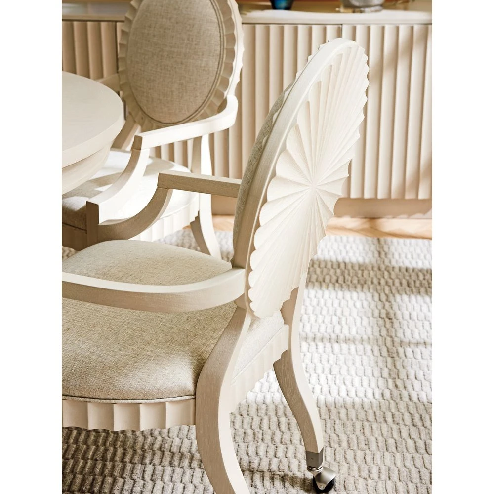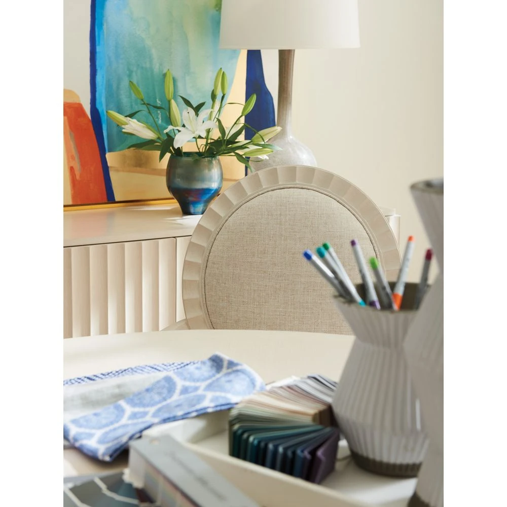 Marketing Copy: Inspired by the timeless elegance of Hollywood Regency and Art Deco styling, designs in Cascades feature scalloped detailing that accentuates the graceful lines and curved fronts that define the distinctive look. Crafted from white oak veneers, pieces are lightly wire-brushed and finished in a fresh linen-white coloration with custom hardware and finials in brushed nickel.