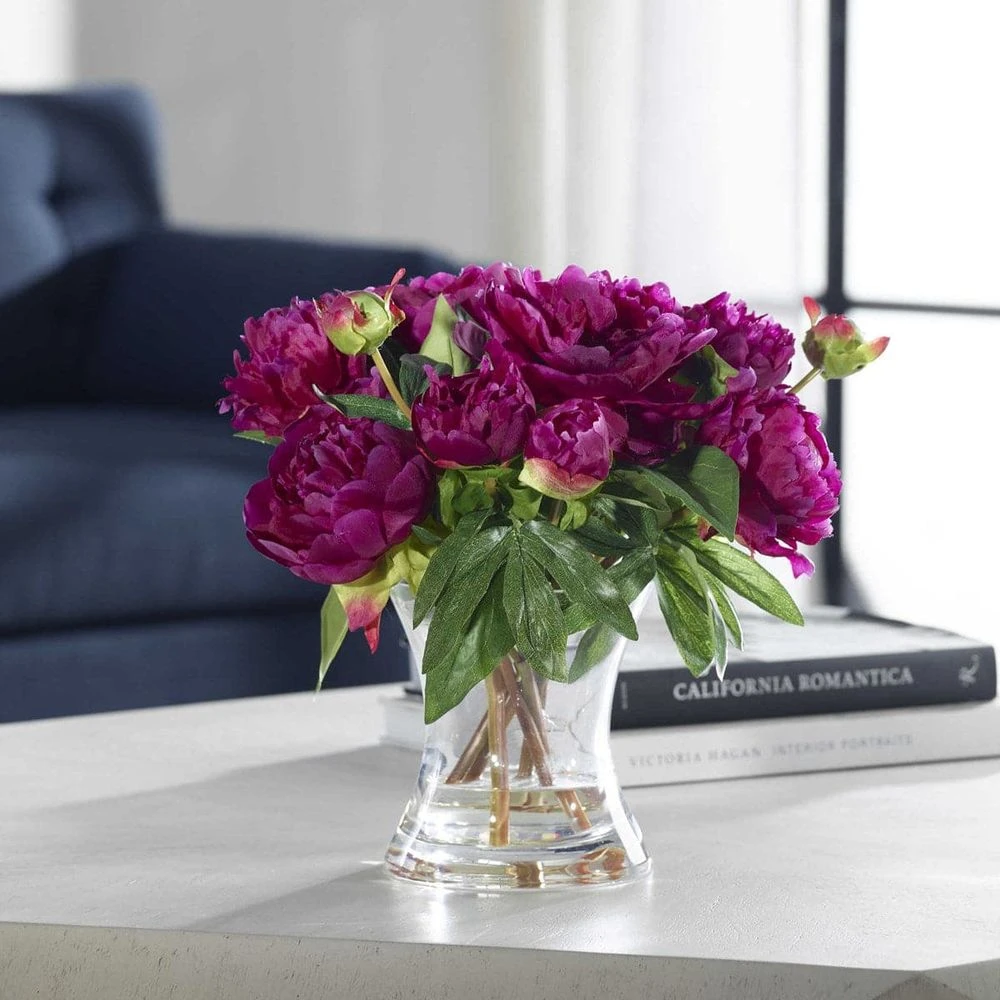 A vivid bunch of lush fuchsia peony cuttings placed in a fluted, clear glass vase with faux water.