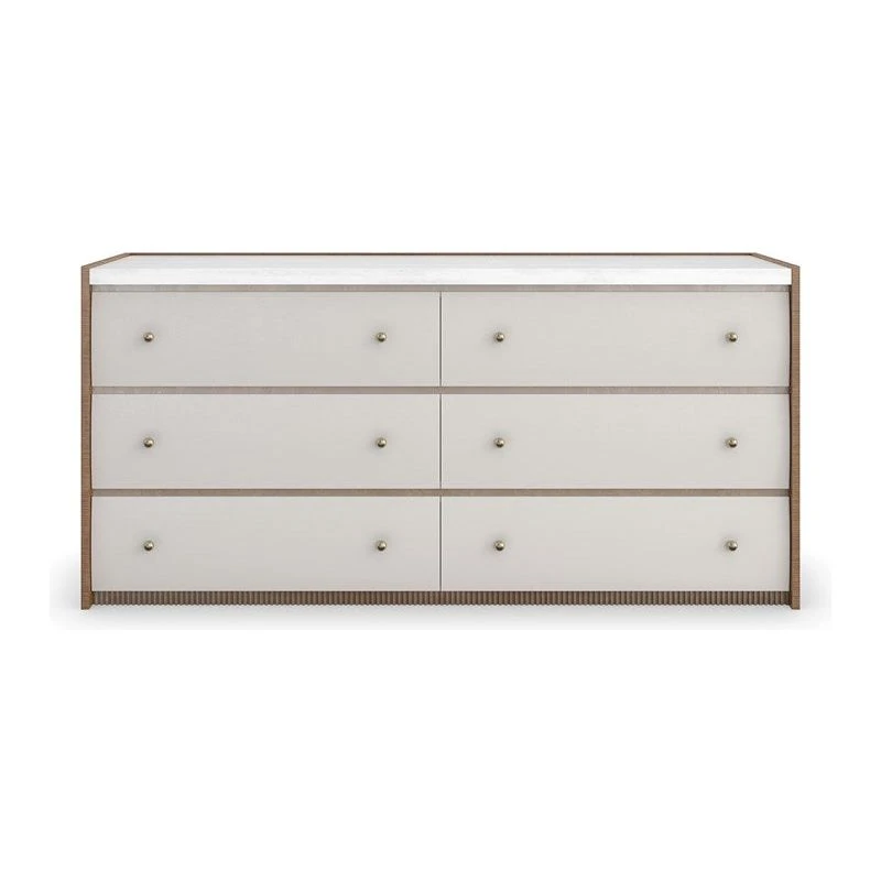 With a rustic elegance reminiscent of rural France, this dresser features tactile drawer fronts in a Rockport Burnished Adobe finish. Drawing the eye to its architectural design: a striated white onyx marble top, warmly contrasted by end panels in Toasted Sycamore and an Antique Bronze Leaf dentil molding detail along the base. Features six spacious drawers with painted interiors and ball hardware in Brushed Gold for an accentuating element that ties it to our Provence bed.