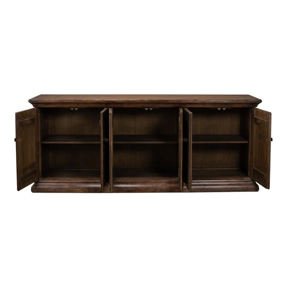At almost counter height, the Provencial Storage Sideboard is perfect for serving. Three pairs of doors. The solid Elm is finished in Toasted Brown. Interior shelves are removable.