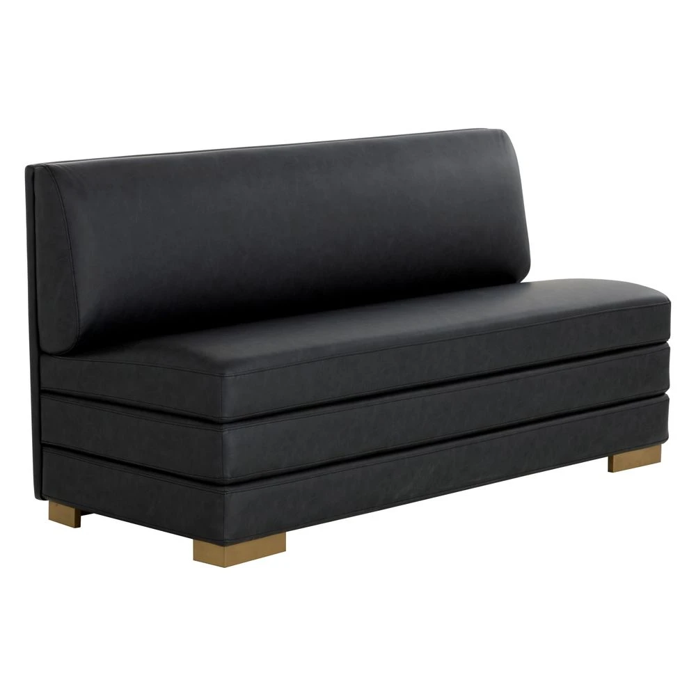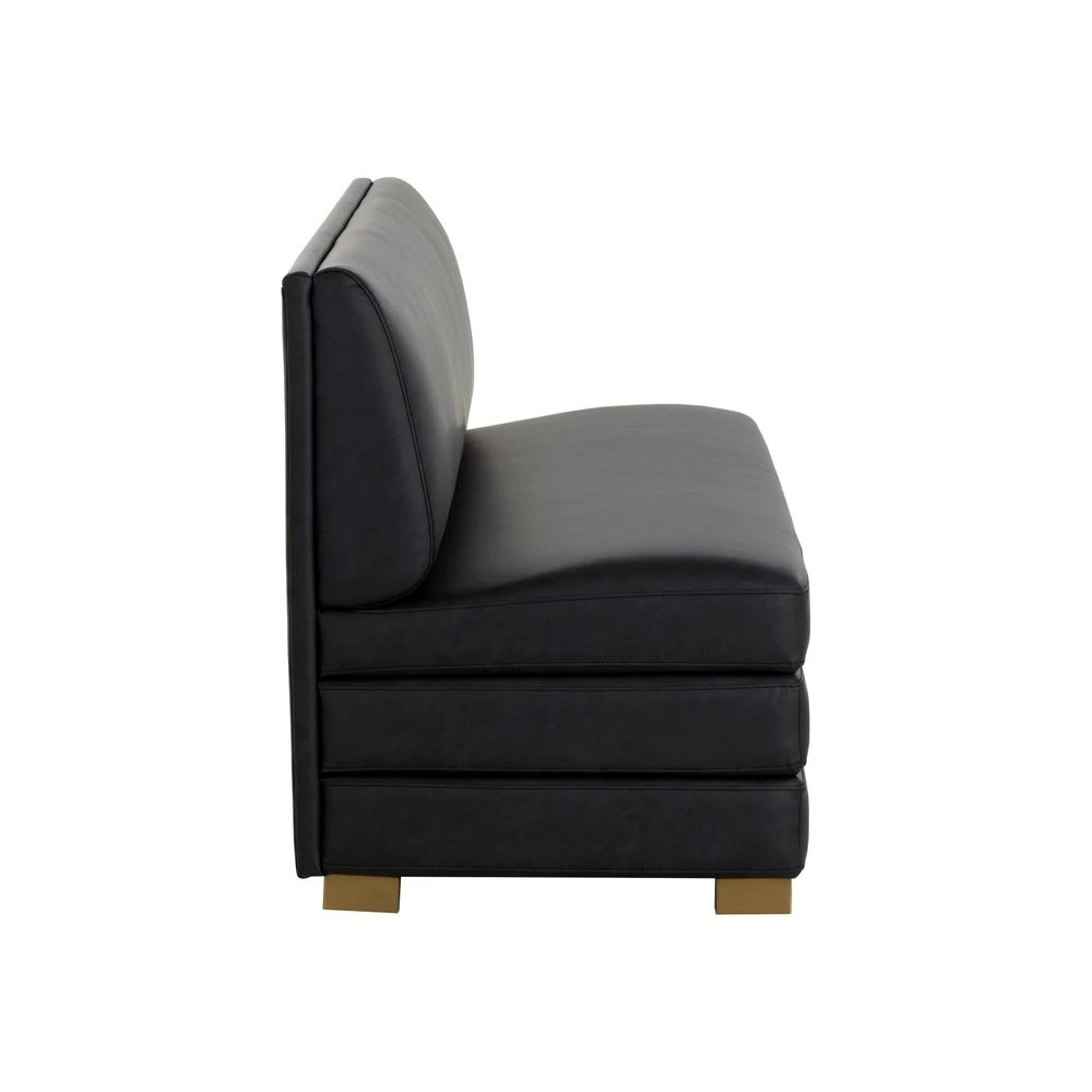 Description: The streamlined design of the Radcliff Banquette enhances the elegance and comfort of your favourite nook. Upholstered in bravo black faux leather with gold stainless steel legs, it is a combination of durability and style. Handle With Care: This design has been crafted with faux leather. Faux leather is manufactured to reflect the natural characteristics of leather; as such, colour variations, markings, wrinkles, grooves, and light scratches are appreciated characteristics. No two pieces will be alike. Visit our Product Care page for more information on how to ensure the lasting beauty of this piece.