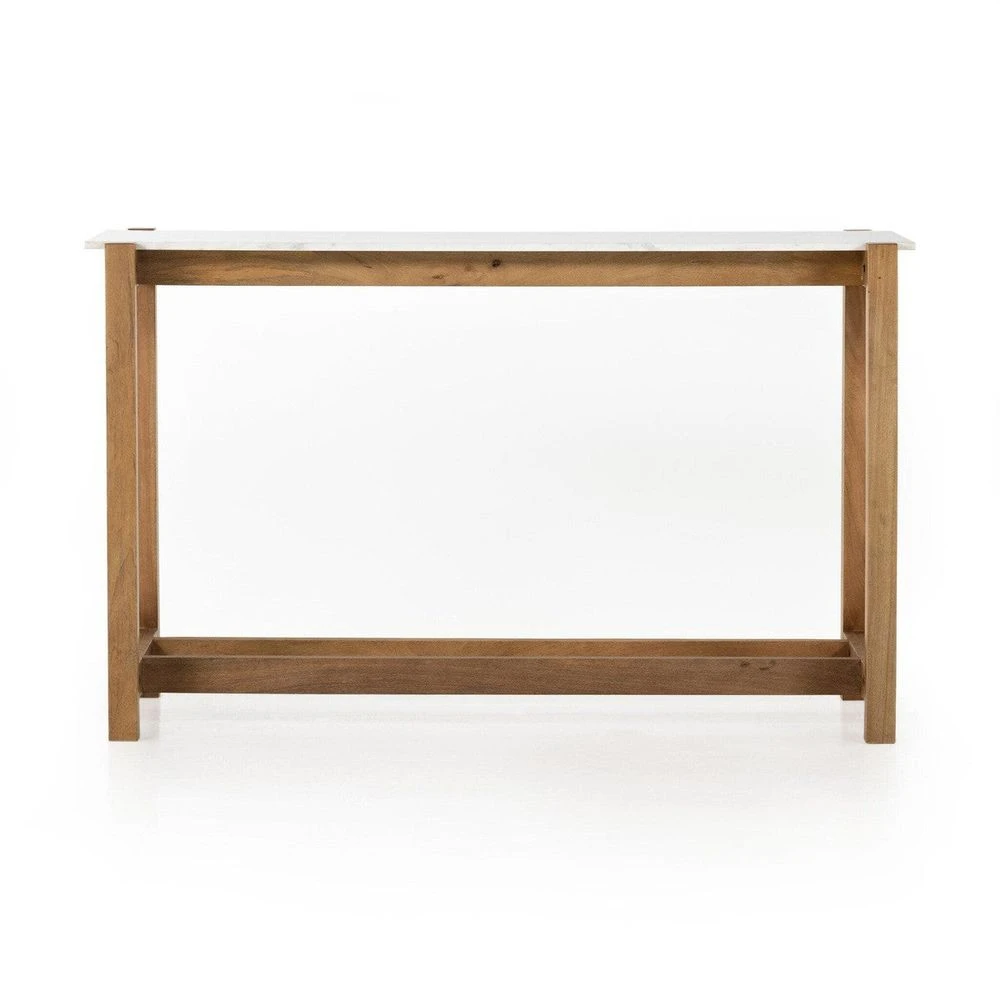 - Description: Simple and streamlined, an eye-catching material mix takes this modern bar table to the next level. Auburn-finished mango forms an open, structured frame for a rectangular tabletop of solid white marble, for a midcentury-infused twist on traditional farmhouse styling.