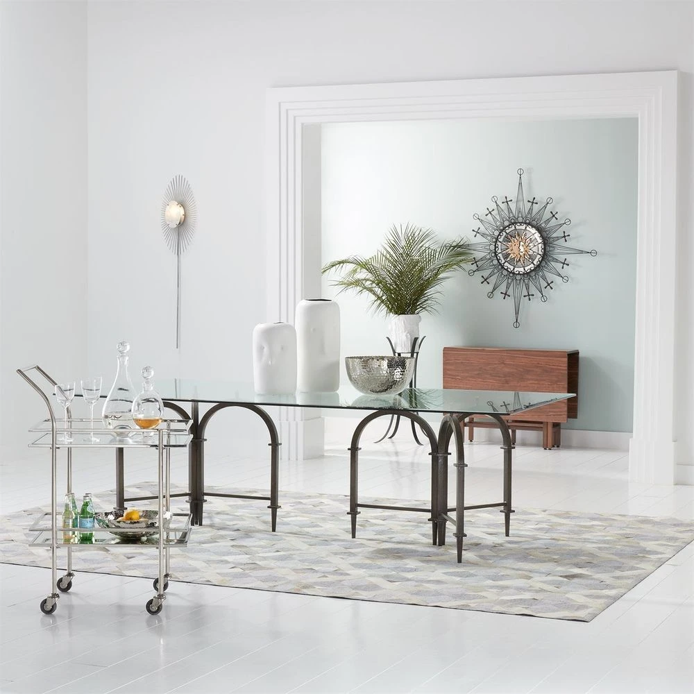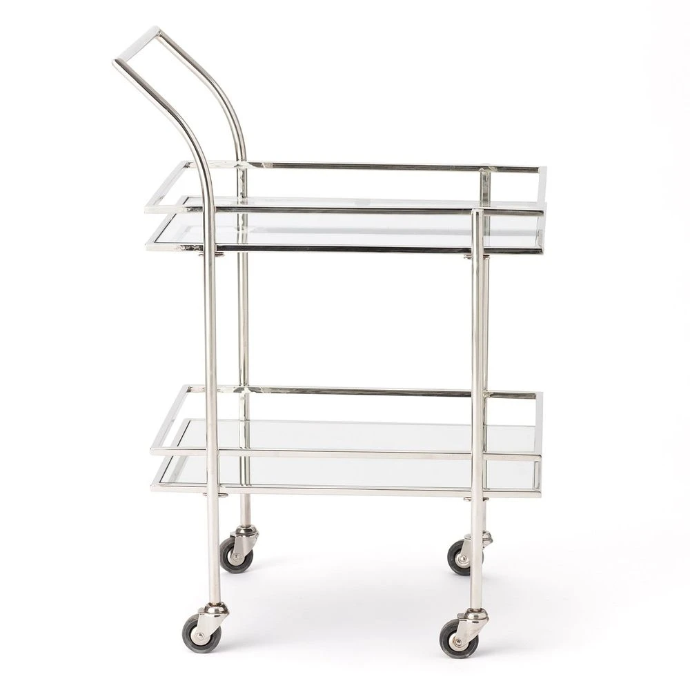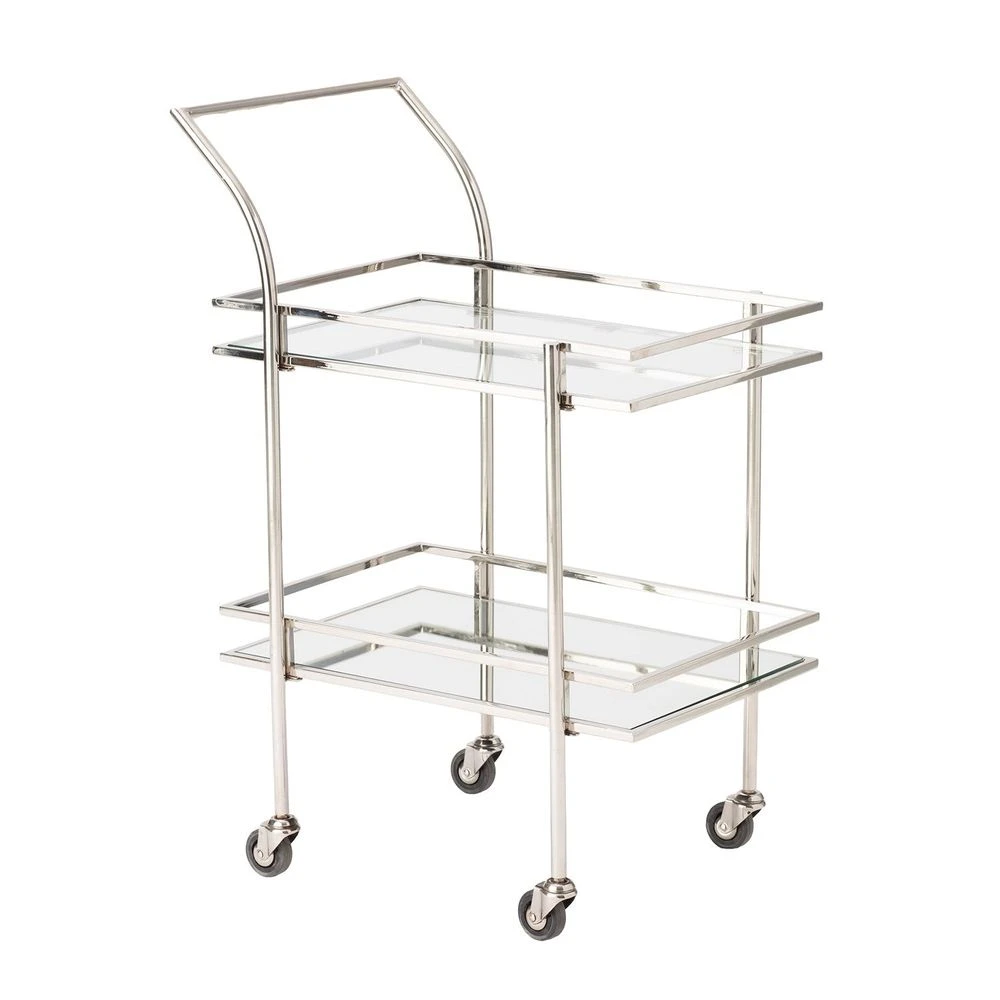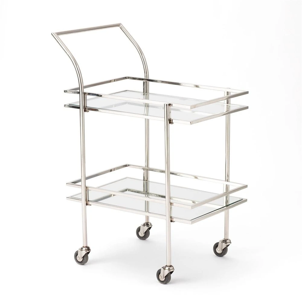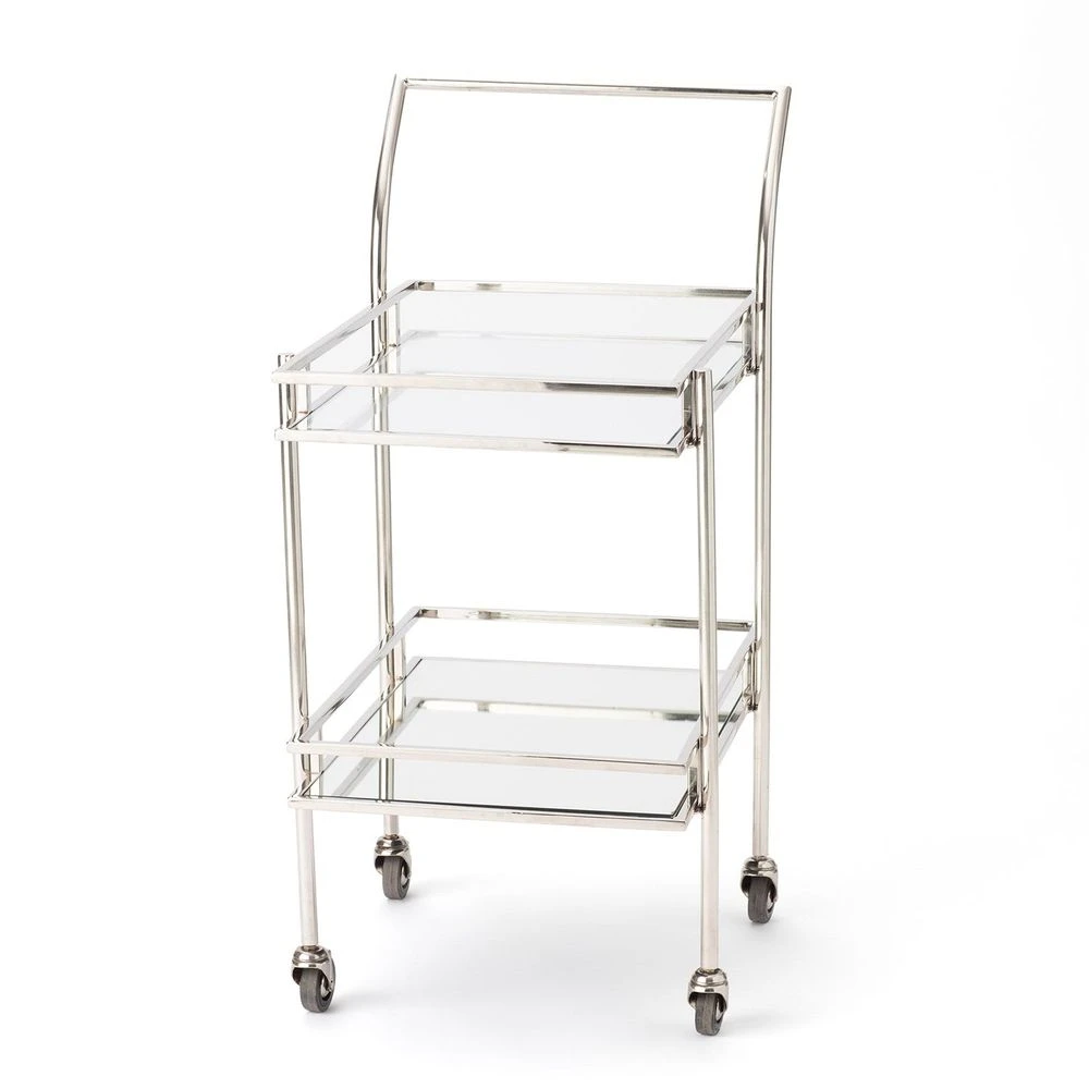 Description: Entertaining is made easy with this versatile Rectangular Mirrored Bar Cart. The bar cart has 2 mirrored shelves which provide a worry free surface to place liquor, mixers, glasses, ice and all the accoutrements necessary for a successful soiree. Finished in polished brass with casters of ease of movement.