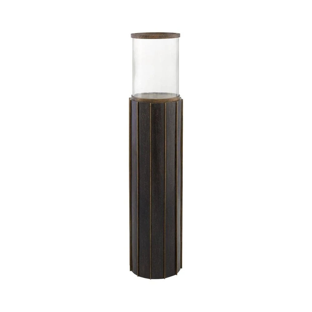 The Reed series of hurricane lamps make a dramatic statement as individual pieces or grouped in multiples. Three sizes of dark brushed mango wood columns are adorned with solid brass strips that are inserted into grooves along the body of the base. Brass detailing and rimmed candle platform are finished in antique brass. The series can be adapted for tabletop display indoors or underneath a covered outdoor area.