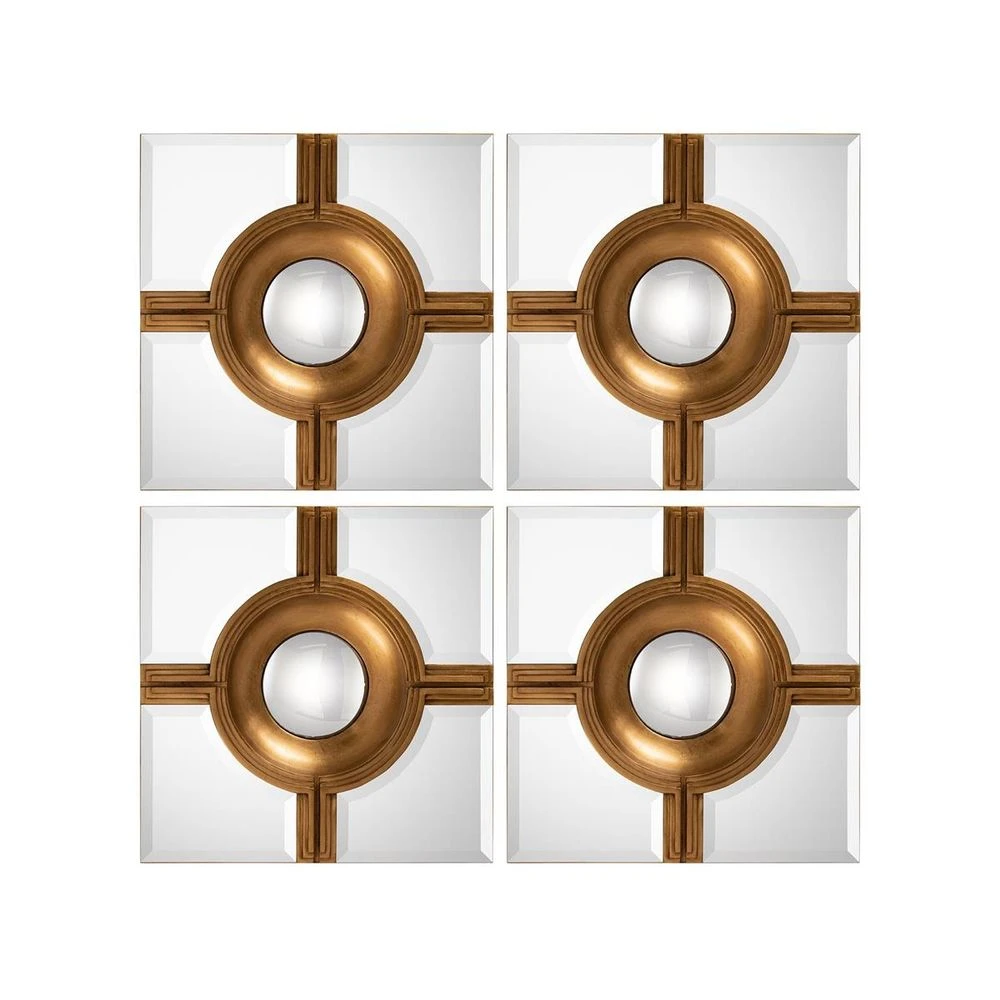 Description: In this set, there are four beautifully beveled, square mirrors, each enhanced in the center with a convex mirror. Framed in a New World gold, each convex mirror adds dimension with its intere