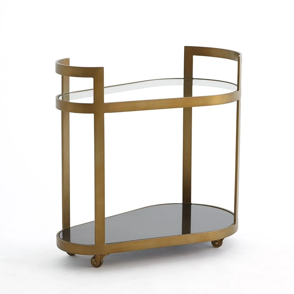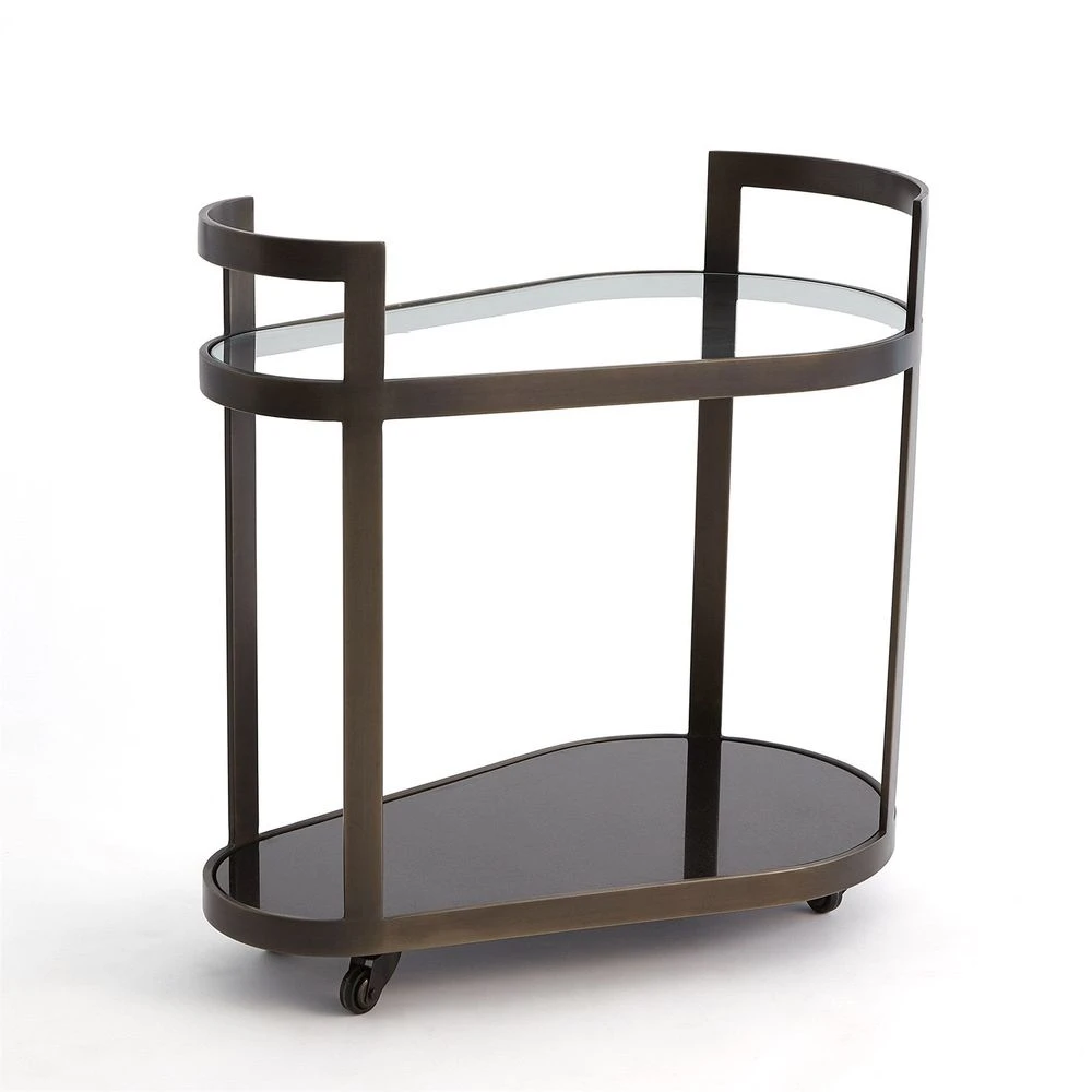 The contemporary Regan Bar cart has a unique ovoid shape and features a solid black granite bottom shelf and clear glass upper shelf. Pivoting casters make for easy mobility. Available in an antique brass or bronze finish.