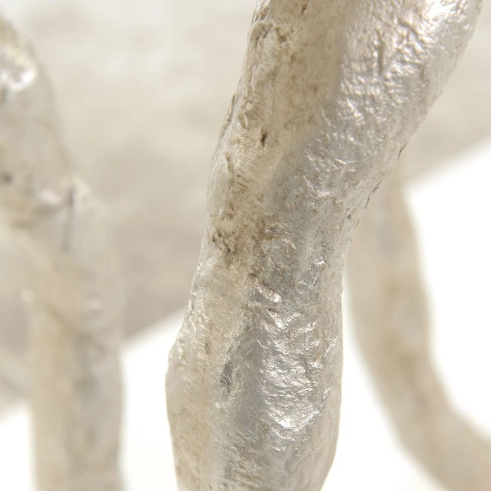 Description: The Reid Console Table showcases an innovative design that blurs the line between furnishing and artistic sculpture. A rectangular wooden tabletop features our popular Tiza Gesso finish, imbuing the piece with a charming light gray tone that greatly elevates the mood of an interior space. The tabletop is matched by a rectangular base, providing stability and cohesion to the piece. The heart of this design lies within three textural rings of aluminum that display a gorgeous Washed Silver finish, matching the neutral tones of the wood while contributing a tasteful sense of luster to any décor.