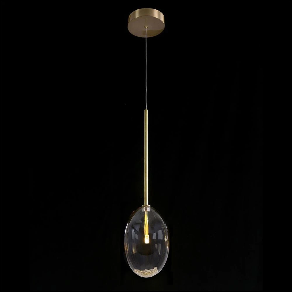 The Echo Droplight features a gorgeous profile that serves as a brilliant focal point in an interior space. An ovate glass globe is held aloft by a slender brass rod in an Antiqued finish. Nestled within the globe, an assortment of miniature glass beads matches the opulent color palette of the sconce, providing a wealth of visual interest.