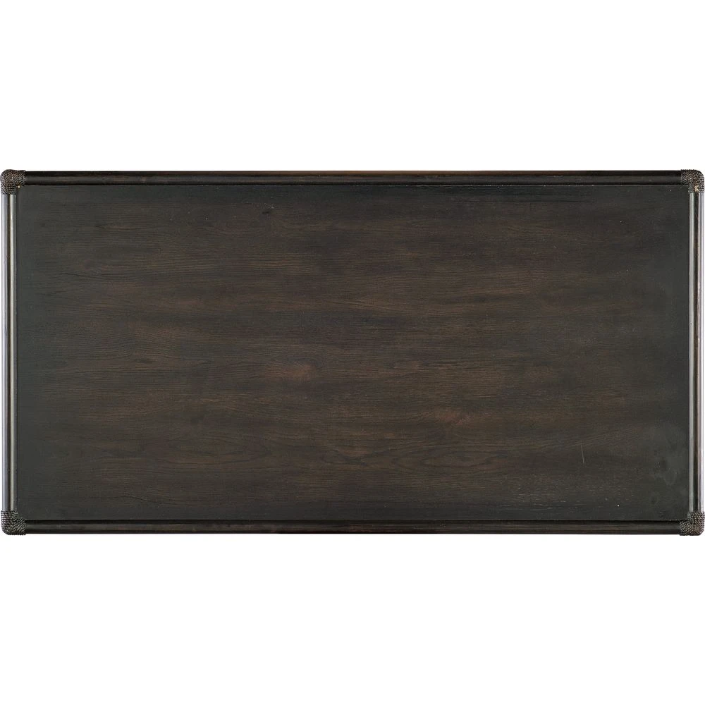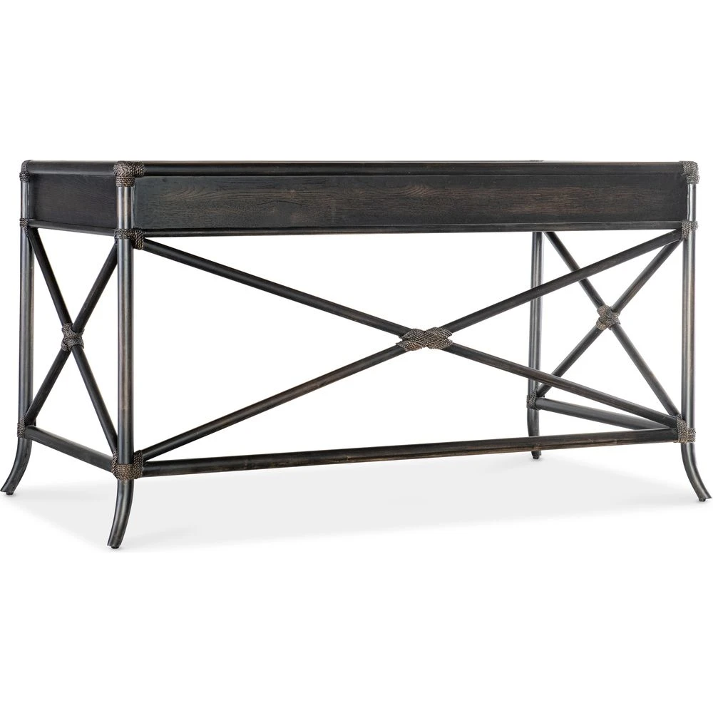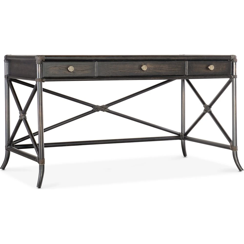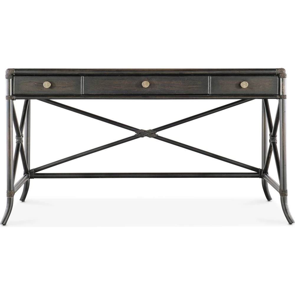 Description: With the sublime vibe of an island oasis, the Retreat Writing Desk is crafted of Oak and Maple Veneers in a Bamboo motif and accented by rope. X-design stretchers on the back and sides distinguish the piece, along with the Black Sand finish, transparent by design to showcase the unique patterns of the wood veneer. Featuring three drawers, the left and right drawers have two removable dividers. One pencil tray and one writing slide may be used on either side, and the center drawer has a drop-front for keyboard use. Finished on all sides.