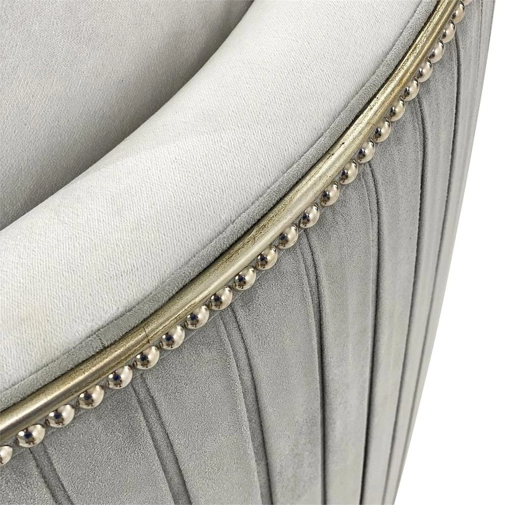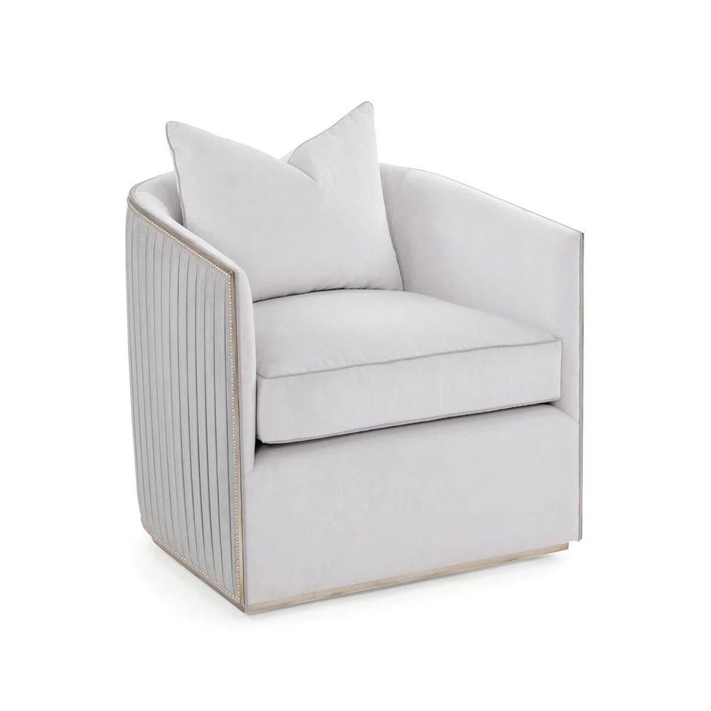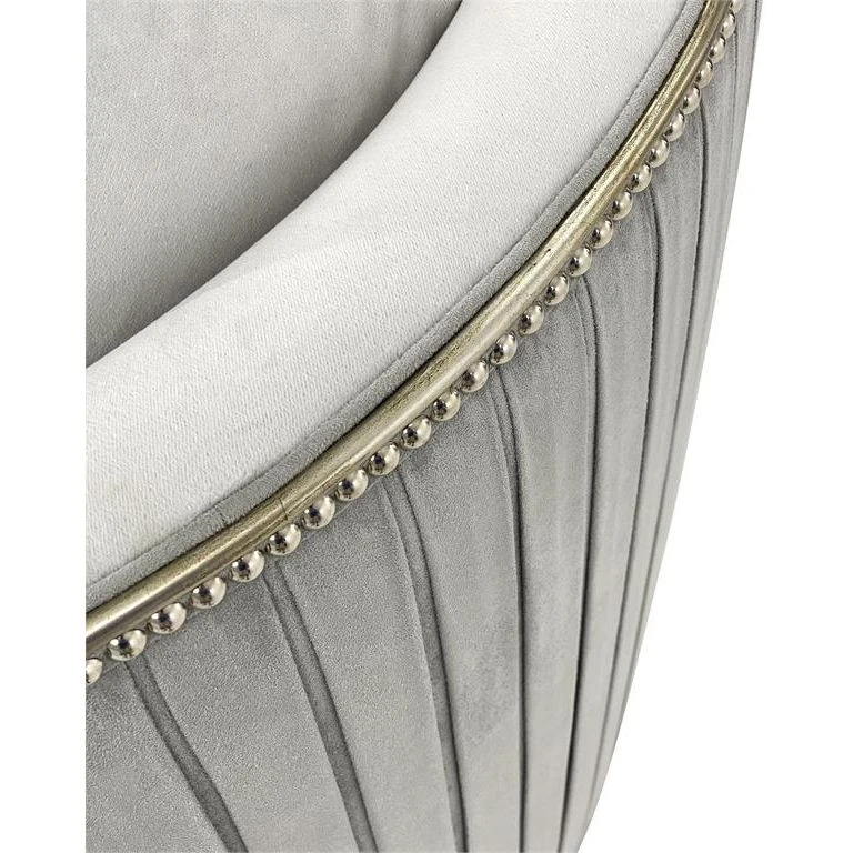 Description: Ridgecrest Swivel Chair shown in V226 Burnished Silver finish and 2205 fabric. This curved-back chair with memory swivel features a sleek wood trim detail in burnished silver. The inside back and seat are upholstered in a pale grey velvet, and a matching 18″ x 23″ back pillow is included. The outside back is hand-pleated in a sophisticated grey microfiber and enhanced by a row of nickel nailheads.
