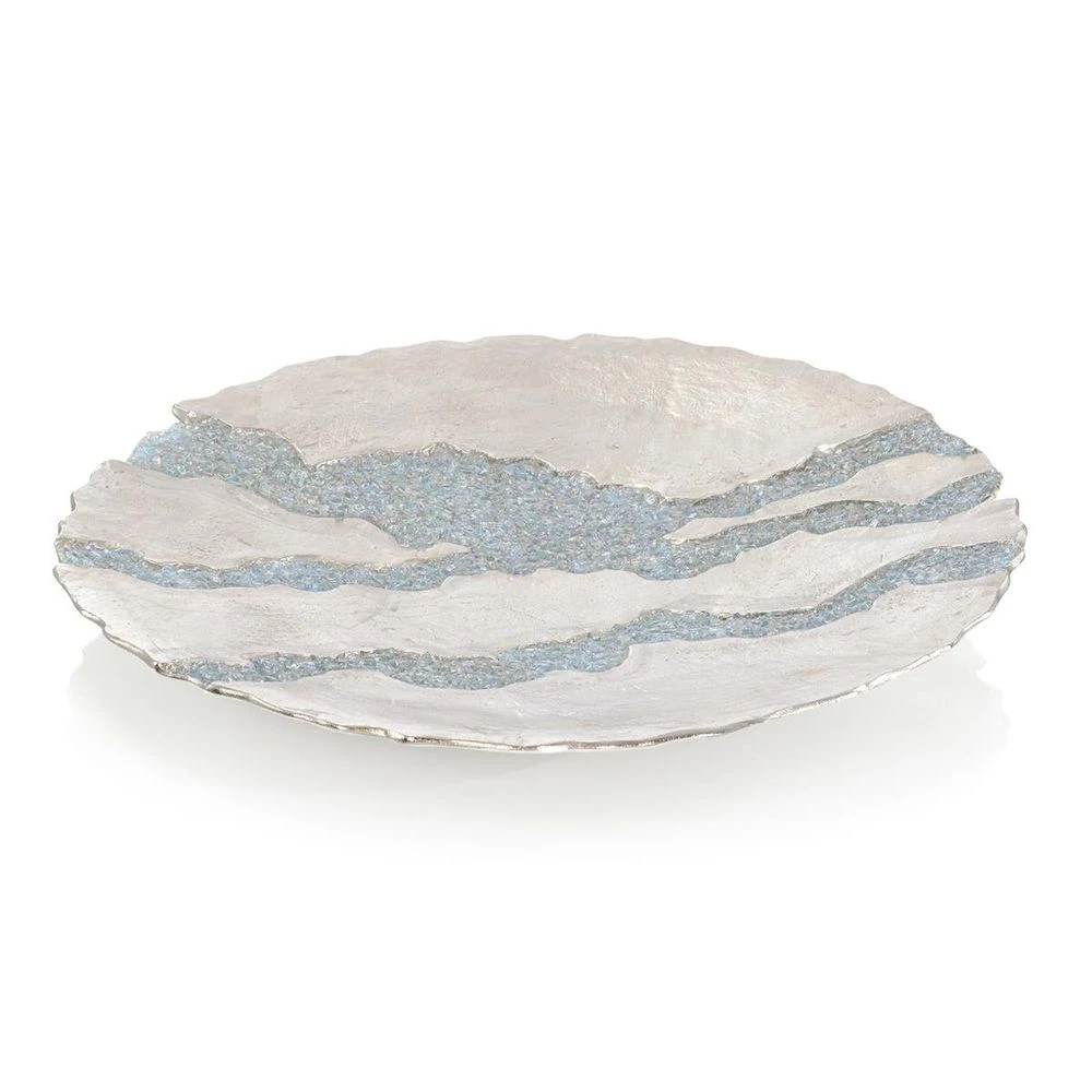 The Divide Charger is a gorgeous accent plate that has been lovingly crafted from enameled metal in a nickel finish. A series of rugged fracture lines, made from blue shards of crushed glass, span the width of the piece to stunning results.