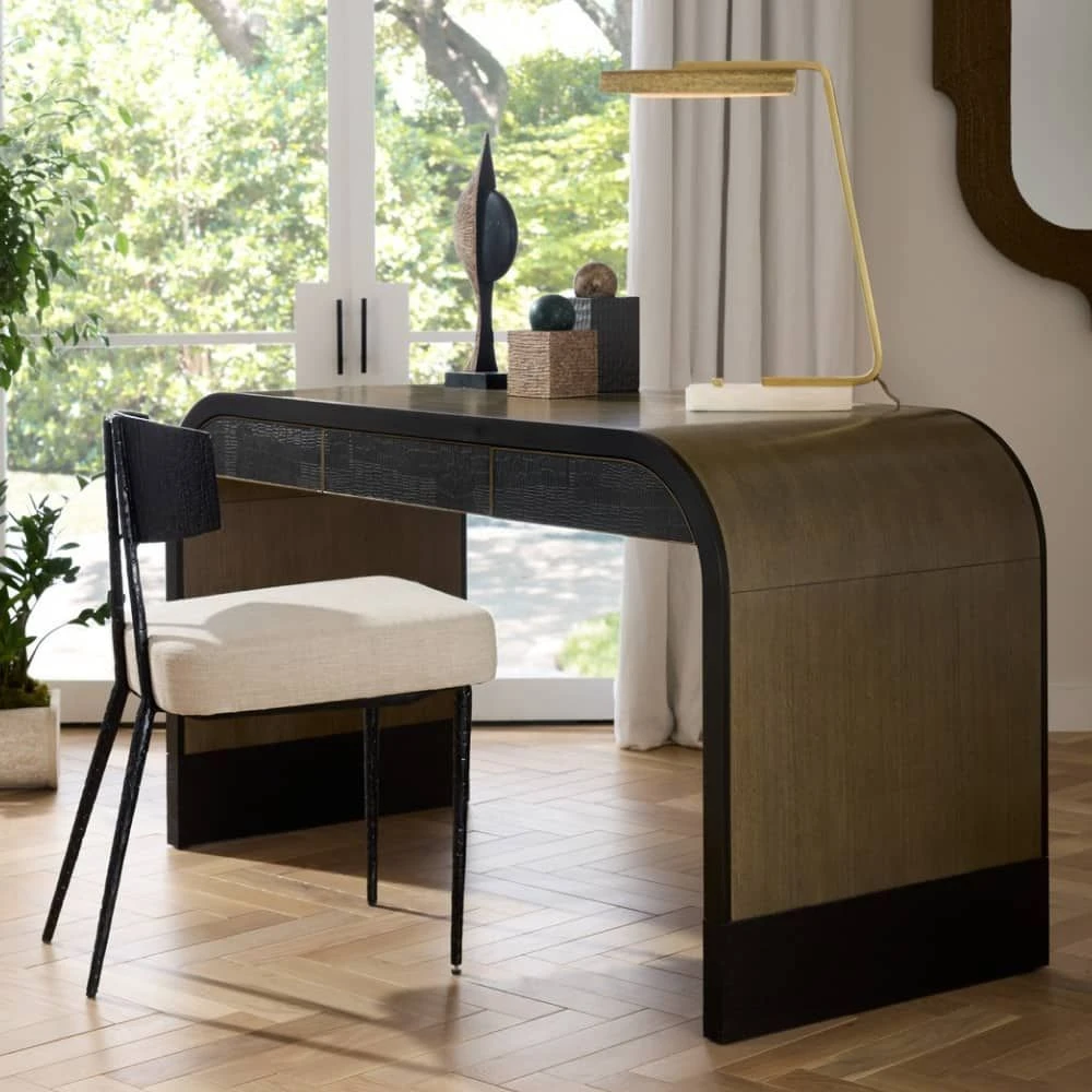 Drawing inspiration from Art Deco design, this black waterfall desk features luxurious chamois gray eucalyptus veneer, providing an elegant textural element for any workspace. The sophisticated soft-close drawers combine textured bronze brass with antique brass trim, complemented by premium ebony oak veneer construction. Note that finish variations may occur across individual pieces.