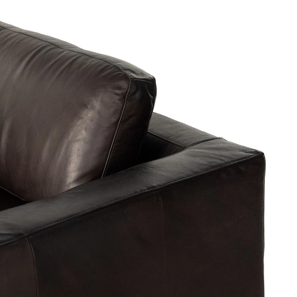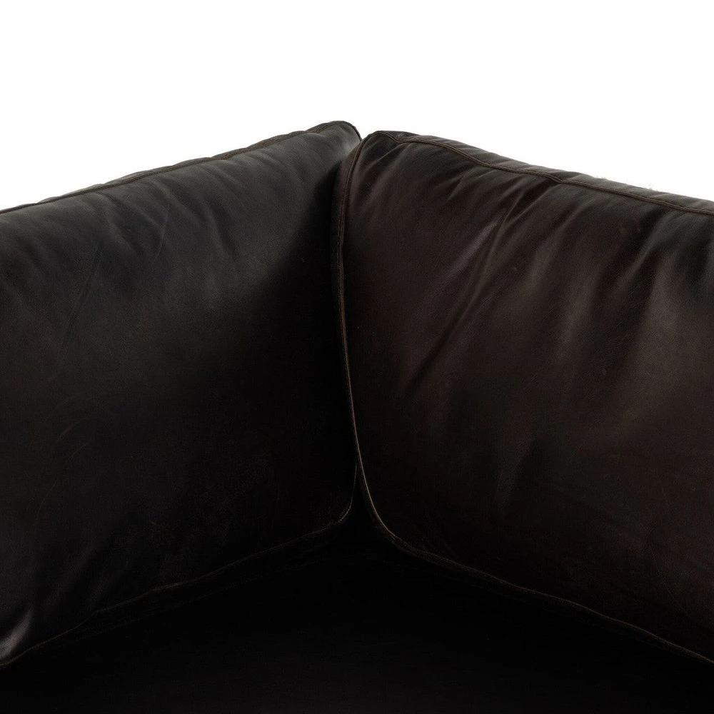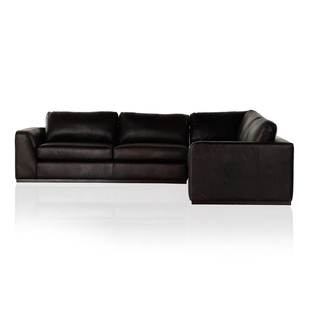 - Description: A simply styled sectional, perfect for everyday lounging. Rich top grain leather makes for a polished presentation, with subtly flared sides for shapely effect, all grounded by a wrapped plinth base.