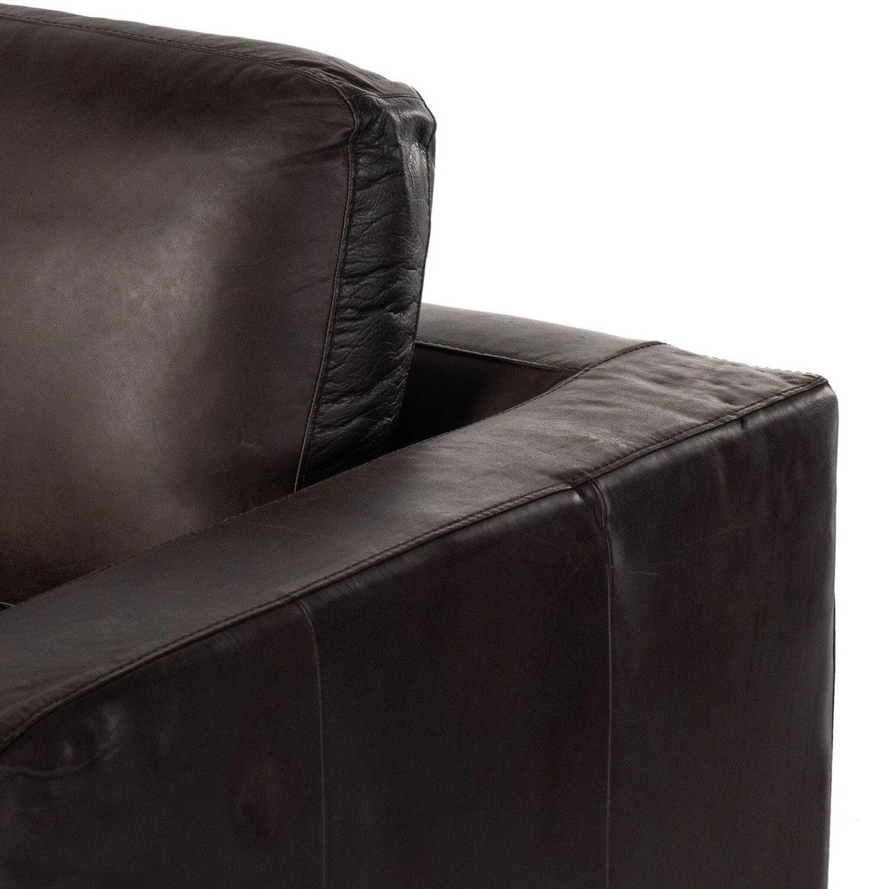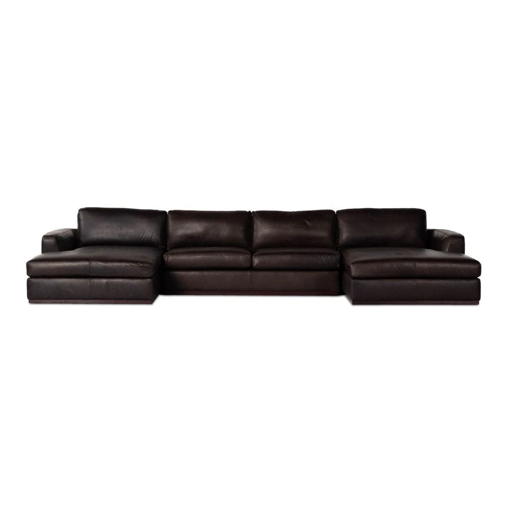 - Description: Simply styled for everyday lounging. A three-piece sectional is upholstered in specialized top-grain leather with subtly flared sides and a wrapped wooden base. Sourced from one of the oldest family-owned tanneries in Italy’s Bassano del Grappa, heirloom leather is salvaged and processed from upcycled hides featuring an abundance of natural markings, scars and color variations. The result? Beautifully supple, buttery soft hides with an unmatched depth of color and richness, and an authentic lived-in look.