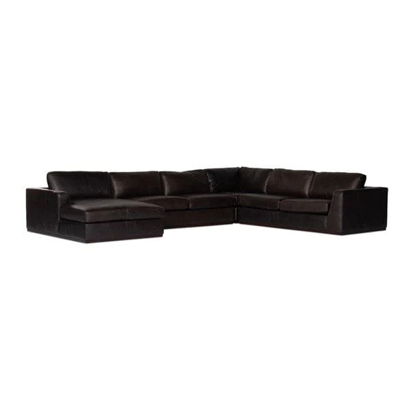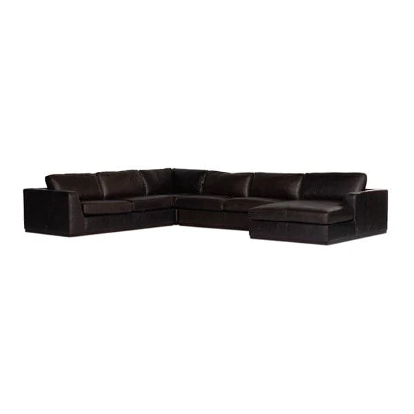 Simply styled for everyday lounging. A four-piece sectional is upholstered in top-grain leather with subtly flared sides and a wrapped wooden base. Sourced from one of the oldest family-owned tanneries in Italy’s Bassano del Grappa, heirloom leather is salvaged and processed from upcycled hides featuring an abundance of natural markings, scars and color variations. The result? Beautifully supple, buttery soft hides with an unmatched depth of color and richness, and an authentic lived-in look.
