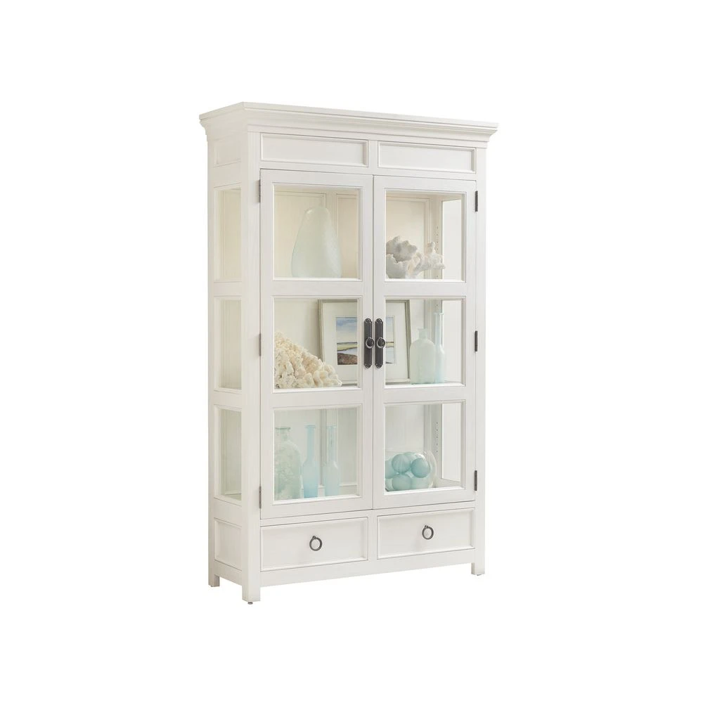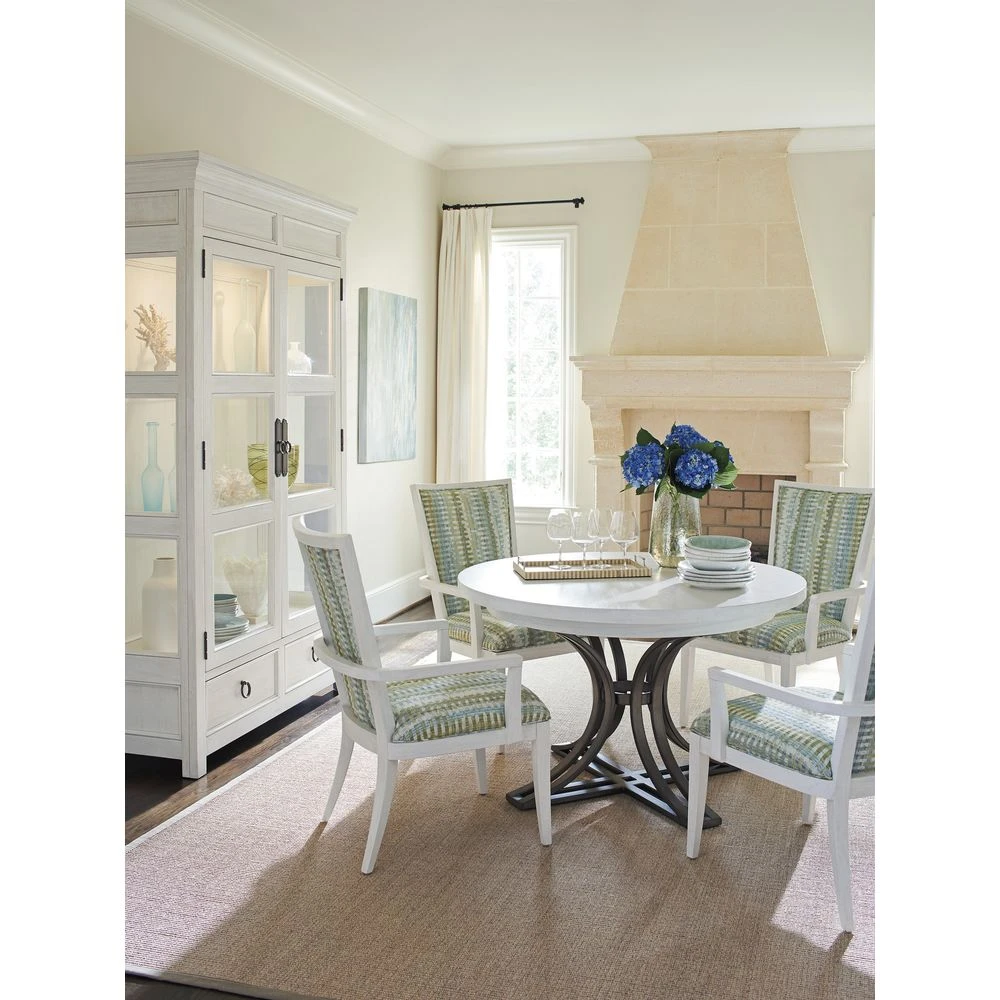 Marketing Copy: Ocean Breeze offers a fresh take on relaxed coastal living with transitional designs crafted from quartered mahogany in a beautiful shell white finish. Natural materials add textural interest and a feel of authenticity to the collection, including leather-wrapped rattan, woven raffia, braided lampakanai and Santa Cruz marble. Custom hardware and metal bases are finished in aged pewter, reinforcing the casual spirit of the designs.