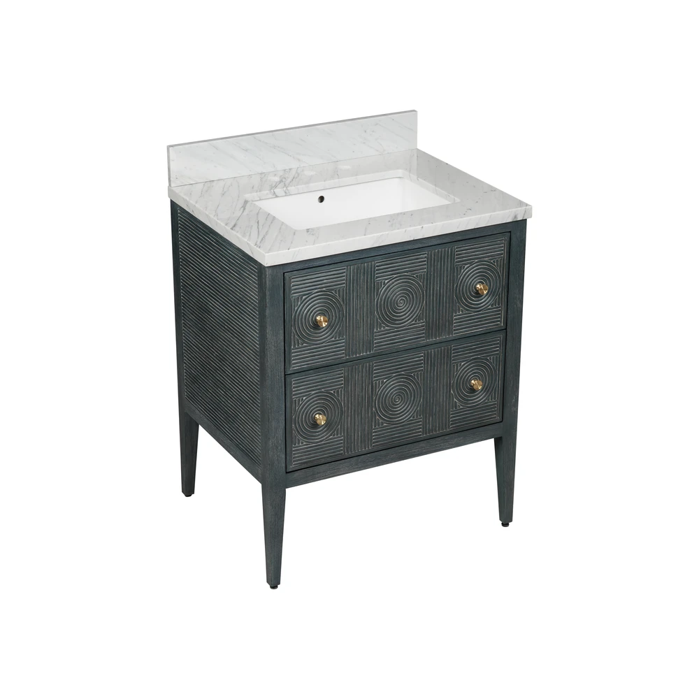 Description: The Santos 28″ Vintage Navy Vanity has a split rattan pattern on the drawers and sides made by hand and applied to a solid mahogany frame. Then a Vintage Navy finish covers the entire piece. Two sets of pulls are included in brass and polished nickel finishes to allow some customization. The vanity has two working drawers, the bottom of which has a removable organizational divider. The white Carrara marble top is fitted with a white rectangular undermount sink. Other fine design attributes include soft-close drawers and a matching removable marble backsplash.