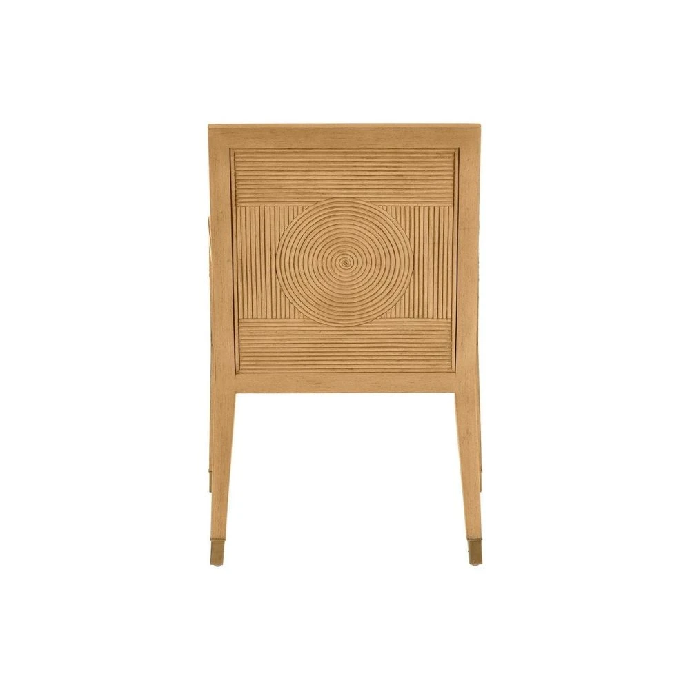 Description: The Santos Sea Sand Armchair has a split rattan pattern on the back, and on the inside and outside of the arms, which is made by hand and applied to a solid mahogany frame. Once the natural material is in place, a sea sand finish covers the back, frame, and legs. The tan armchair is upholstered in a Liller Malt material. The chair has brass ferrules to add sophistication to the overall design.