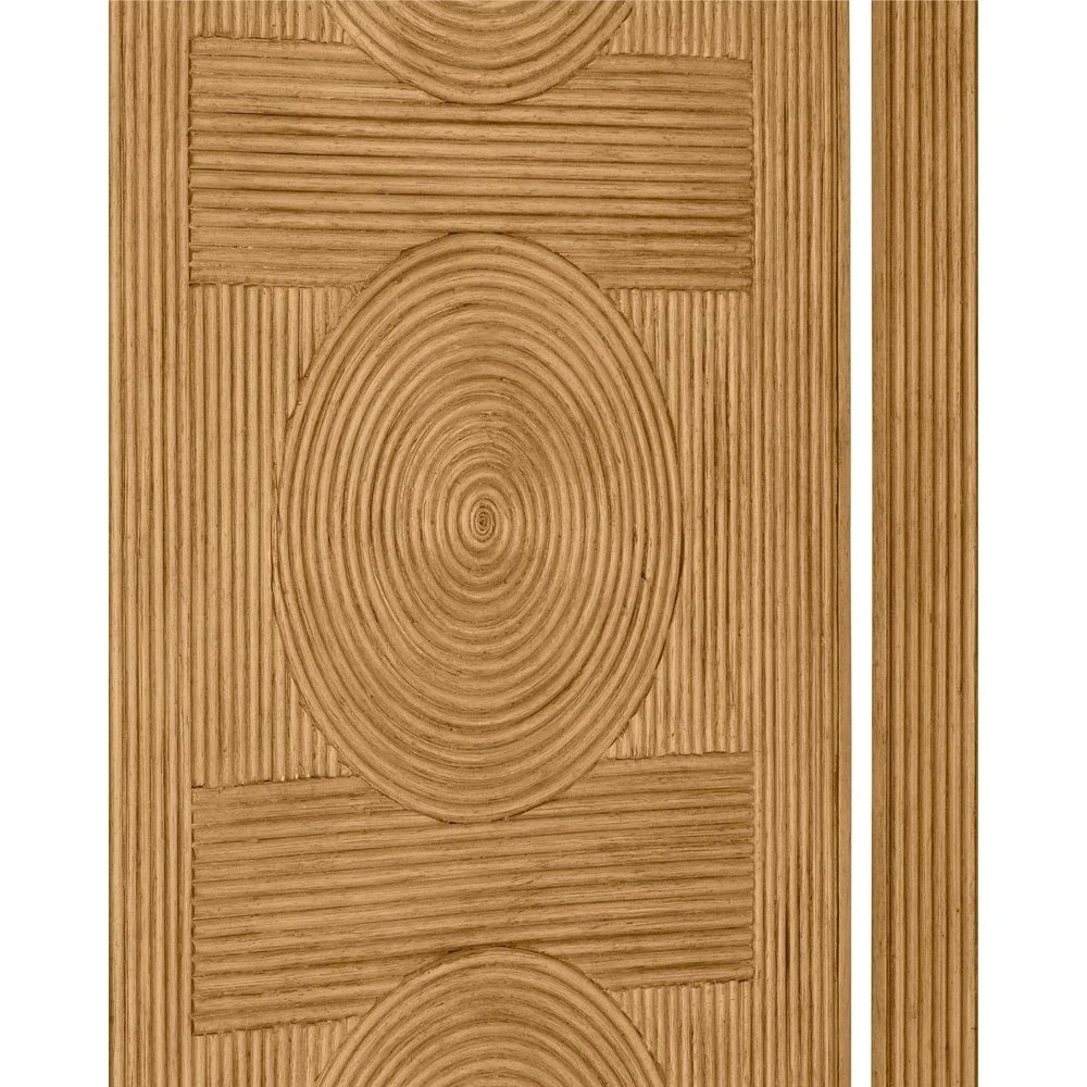 Description: The Santos Sea Sand Screen has a split rattan pattern on both sides of each folding section, which is made by hand and applied to a solid mahogany frame. Then a sea sand finish is applied to the entire piece. A design detail of note is how the five layered circular patterns flow into the horizontal segments of the pattern to create textural interest. This tan room screen was designed by Aimee Kurzner.