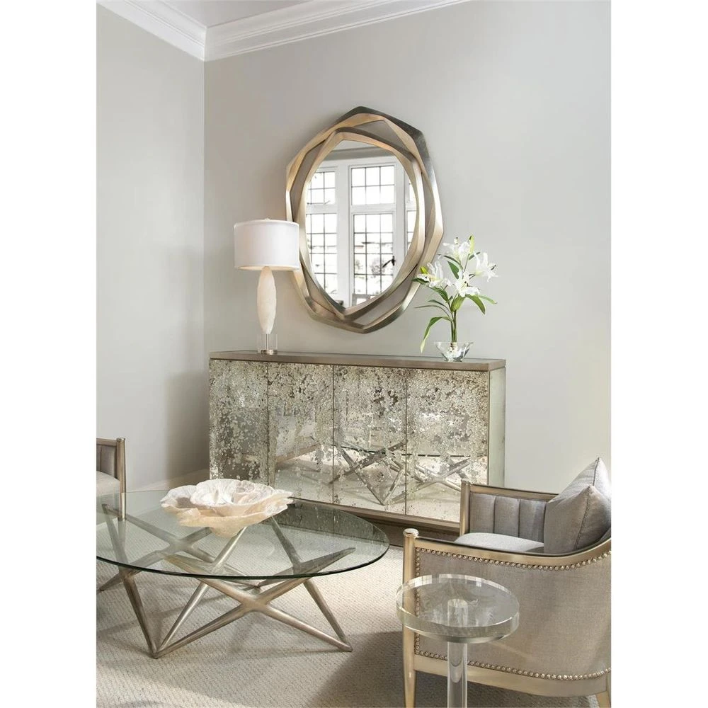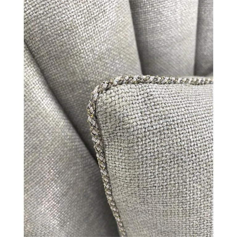 Sapphire Chair shown in V226 Burnished Silver finish and 4065 fabric. This deco-inspired chair is finished in burnished silver. It features decorative arm caps made from faceted moonstones set in a polished nickel bezel. The graceful legs are enhanced with polished nickel ferrules. It has a channeled inside back and is upholstered in a silver glazed linen. The outside back is detailed with nickel nailheads. A matching back pillow is included.